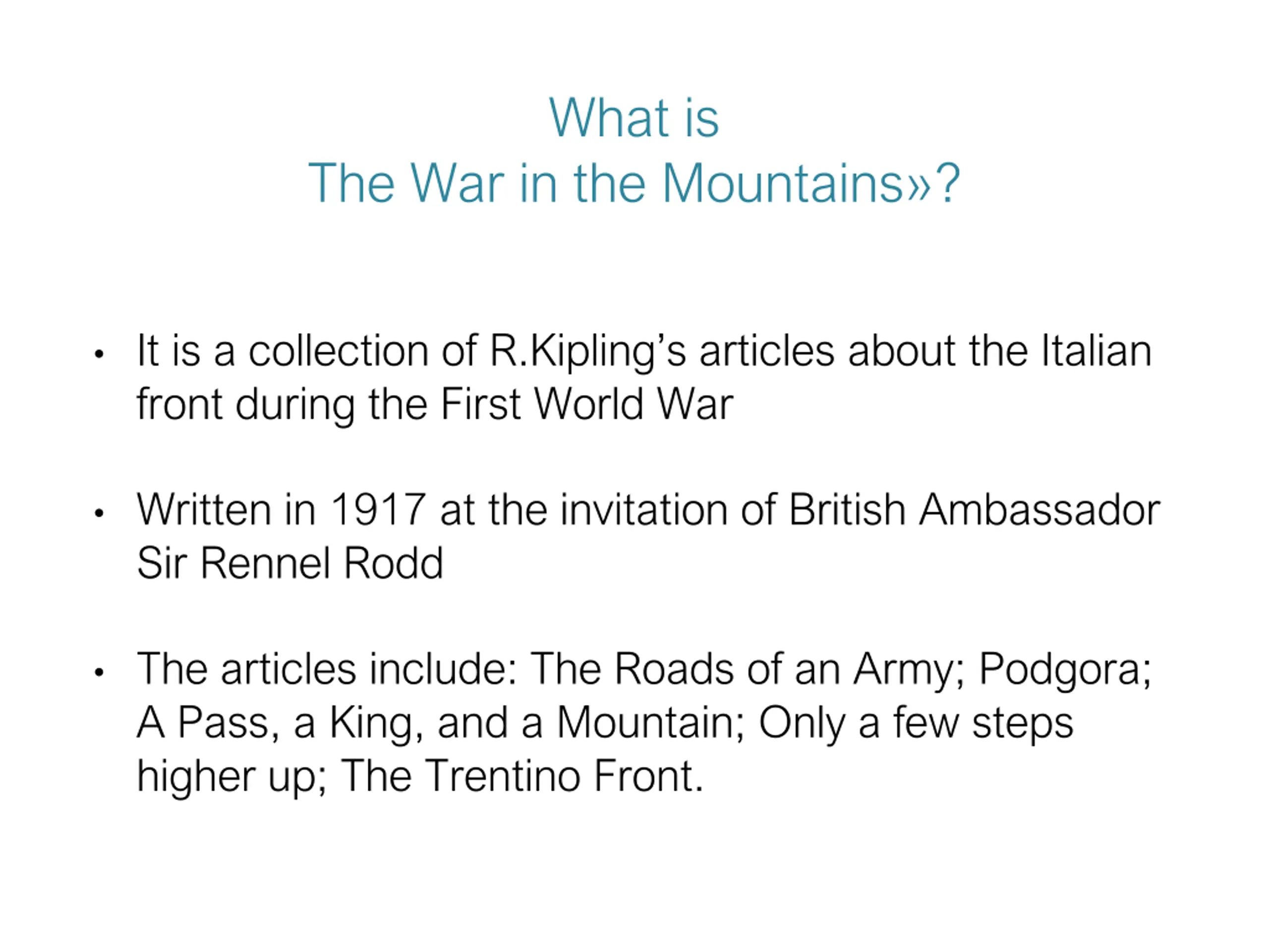 What is The War in the Mountains ? It is a collection of R.Kipling s articles about the Italian front during the First World War Written in 1917 at the invitation of British Ambassador Sir Rennel Rodd The articles include: The Roads of an Army; Podgora; A Pass, a King, and a Mountain; Only a few steps higher up; The Trentino Front.