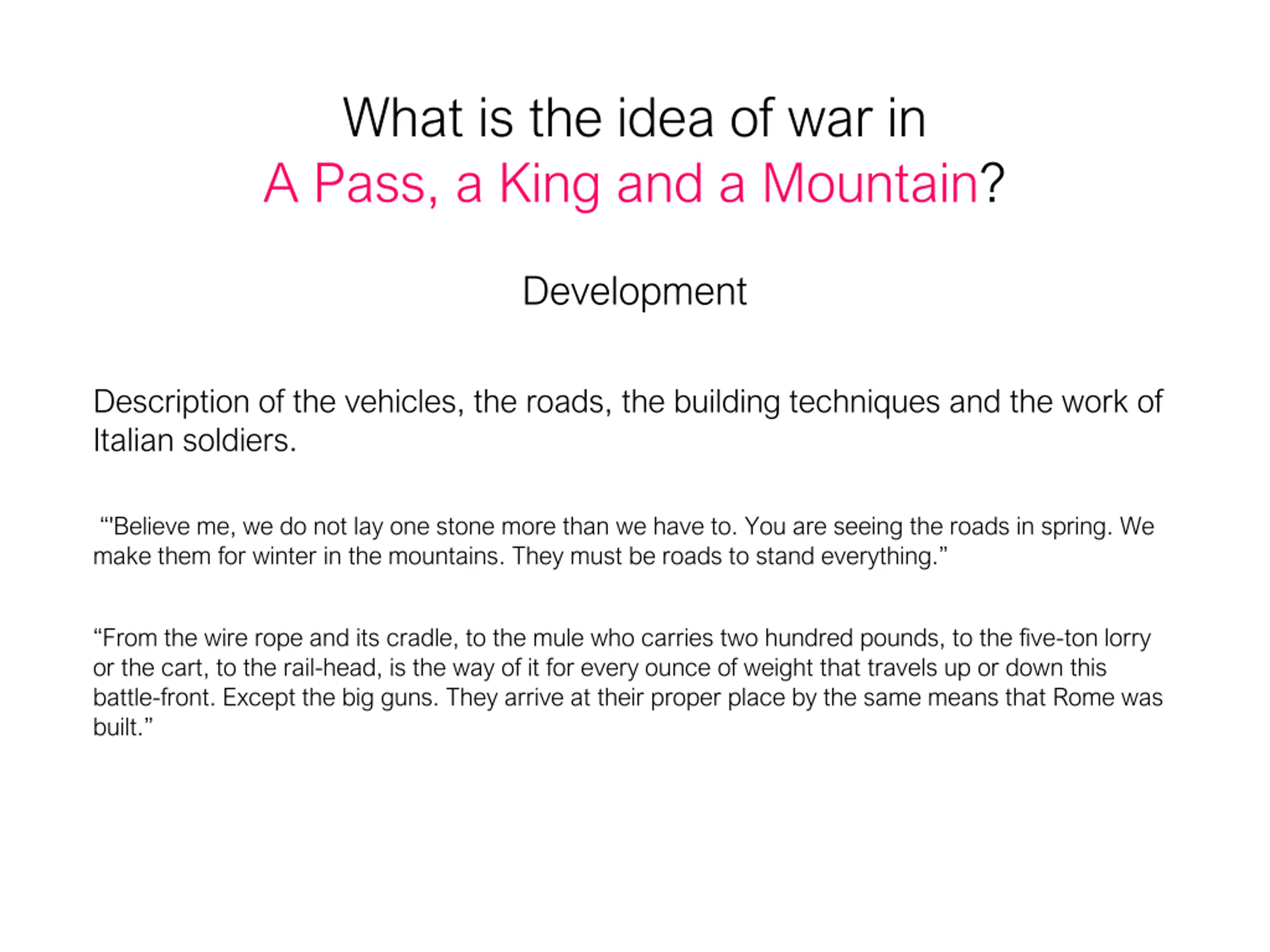 What is the idea of war in A Pass, a King and a Mountain? Development Description of the vehicles, the roads, the building techniques and the work of Italian soldiers. 'Believe me, we do not lay one stone more than we have to. You are seeing the roads in spring. We make them for winter in the mountains. They must be roads to stand everything. From the wire rope and its cradle, to the mule who carries two hundred pounds, to the five-ton lorry or the cart, to the rail-head, is the way of it for every ounce of weight that travels up or down this battle-front. Except the big guns. They arrive at their proper place by the same means that Rome was built.