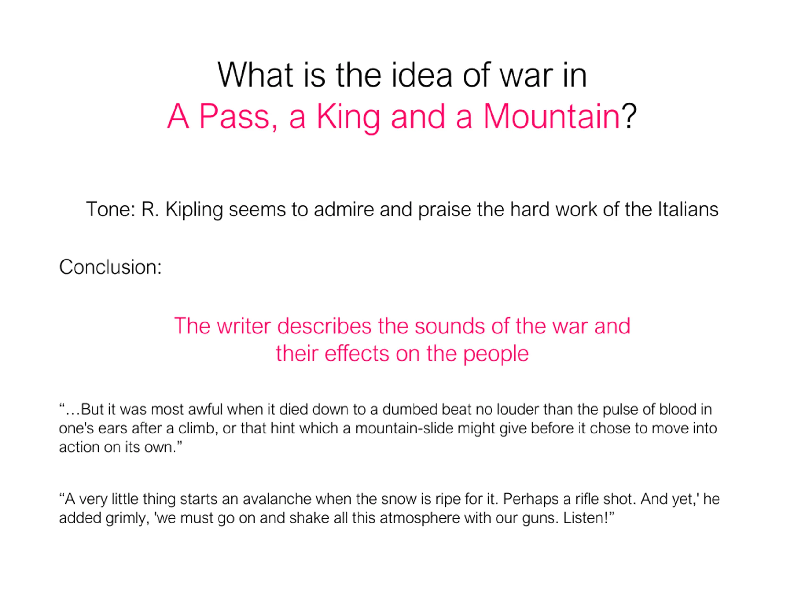 What is the idea of war in A Pass, a King and a Mountain? Tone: R. Kipling seems to admire and praise the hard work of the Italians Conclusion: The writer describes the sounds of the war and their effects on the people But it was most awful when it died down to a dumbed beat no louder than the pulse of blood in one's ears after a climb, or that hint which a mountain-slide might give before it chose to move into action on its own. A very little thing starts an avalanche when the snow is ripe for it. Perhaps a rifle shot. And yet,' he added grimly, 'we must go on and shake all this atmosphere with our guns. Listen!