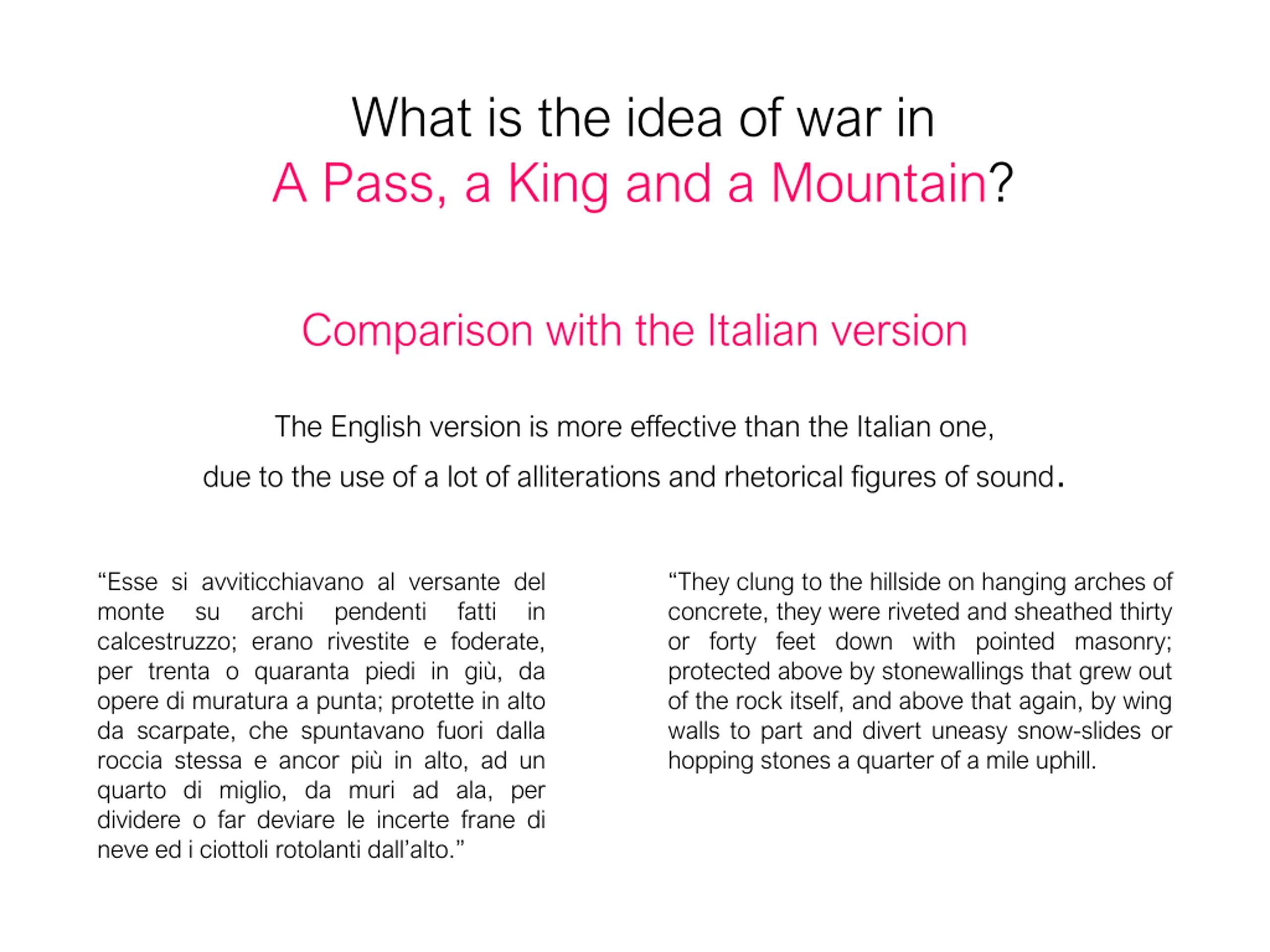 What is the idea of war in A Pass, a King and a Mountain? Comparison with the Italian version The English version is more effective than the Italian one, due to the use of a lot of alliterations and rhetorical figures of sound. Esse si avviticchiavano al versante del monte su archi calcestruzzo; erano rivestite e foderate, per trenta o quaranta piedi in gi , da opere di muratura a punta; protette in alto da scarpate, che spuntavano fuori dalla roccia stessa e ancor pi in alto, ad un quarto di miglio, da muri ad ala, per dividere o far deviare le incerte frane di neve ed i ciottoli rotolanti dall alto. They clung to the hillside on hanging arches of concrete, they were riveted and sheathed thirty or forty feet down with pointed masonry; protected above by stonewallings that grew out of the rock itself, and above that again, by wing walls to part and divert uneasy snow-slides or hopping stones a quarter of a mile uphill. pendenti fatti in