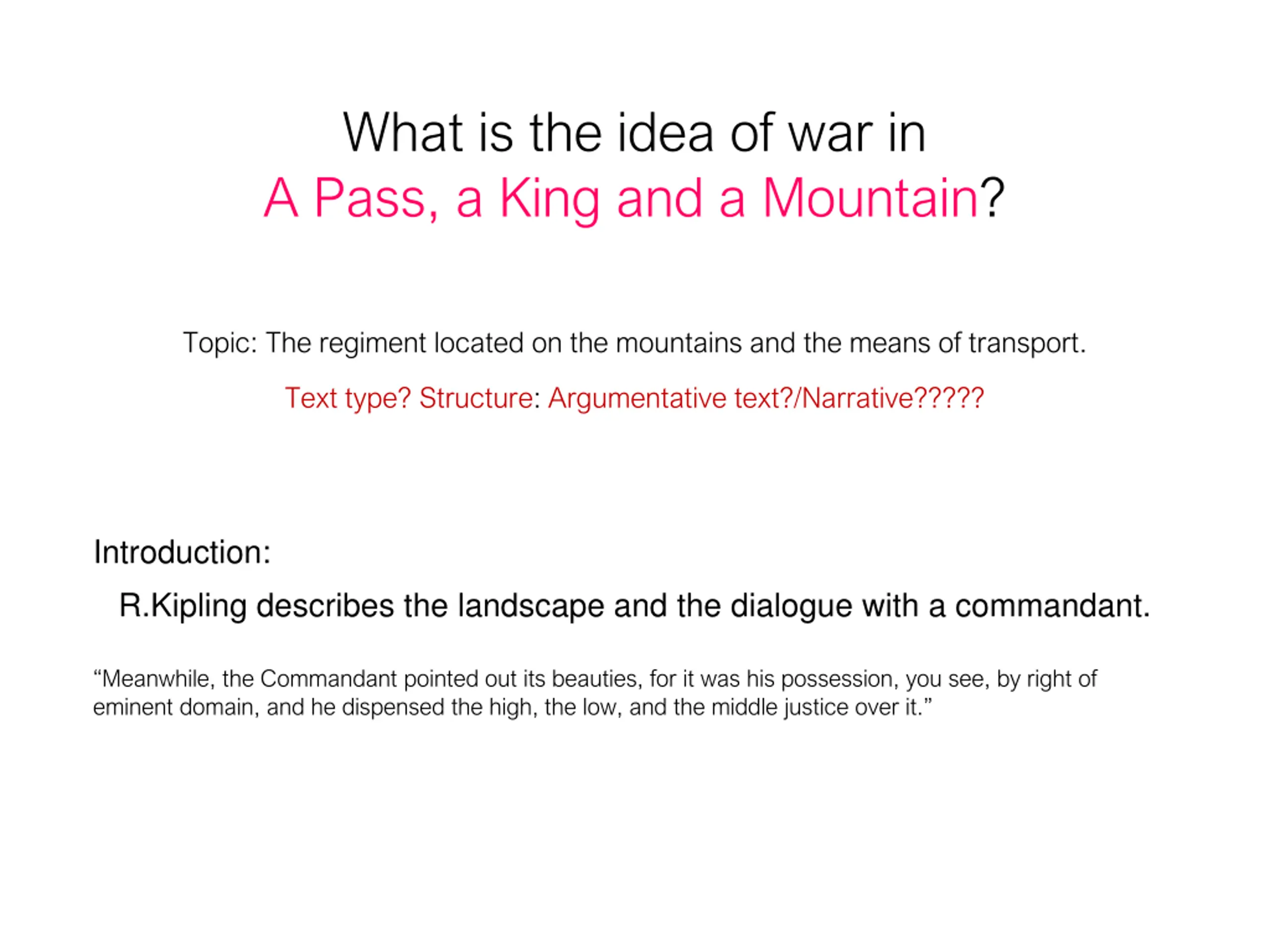 What is the idea of war in A Pass, a King and a Mountain? Topic: The regiment located on the mountains and the means of transport. Text type? Structure: Argumentative text?/Narrative????? Introduction: R.Kipling describes the landscape and the dialogue with a commandant. Meanwhile, the Commandant pointed out its beauties, for it was his possession, you see, by right of eminent domain, and he dispensed the high, the low, and the middle justice over it.