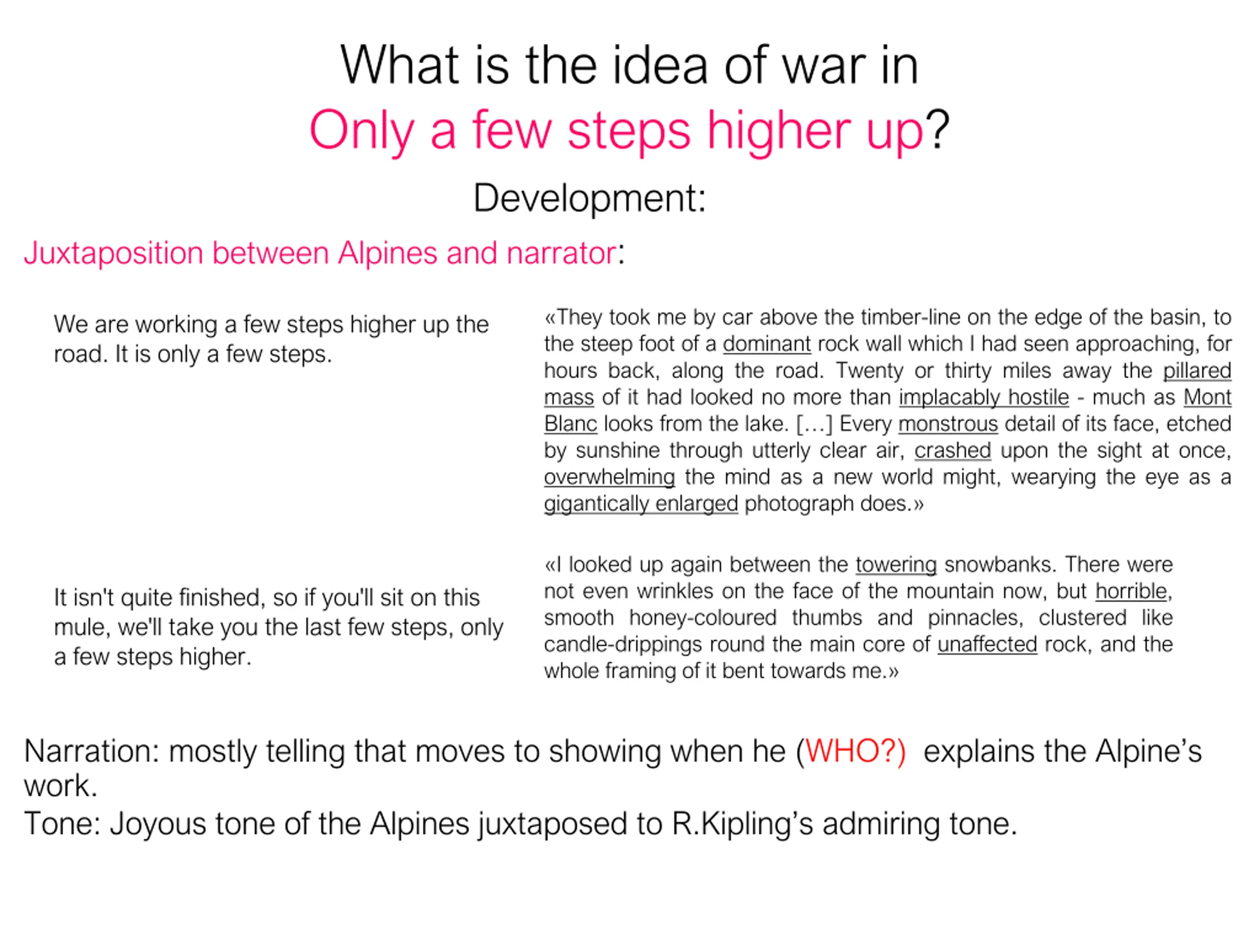 What is the idea of war in Only a few steps higher up? Development: Juxtaposition between Alpines and narrator: They took me by car above the timber-line on the edge of the basin, to the steep foot of a dominant rock wall which I had seen approaching, for hours back, along the road. Twenty or thirty miles away the pillared mass of it had looked no more than implacably hostile - much as Mont Blanc looks from the lake. [ ] Every monstrous detail of its face, etched by sunshine through utterly clear air, crashed upon the sight at once, overwhelming the mind as a new world might, wearying the eye as a gigantically enlarged photograph does. We are working a few steps higher up the road. It is only a few steps. I looked up again between the towering snowbanks. There were not even wrinkles on the face of the mountain now, but horrible, smooth honey-coloured thumbs and pinnacles, clustered like candle-drippings round the main core of unaffected rock, and the whole framing of it bent towards me. It isn't quite finished, so if you'll sit on this mule, we'll take you the last few steps, only a few steps higher. Narration: mostly telling that moves to showing when he (WHO?) explains the Alpine s work. Tone: Joyous tone of the Alpines juxtaposed to R.Kipling s admiring tone.