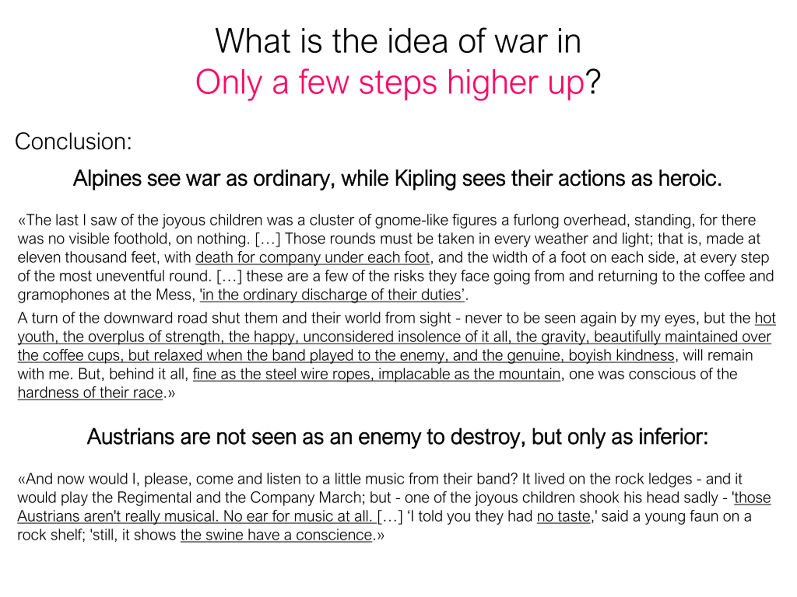 What is the idea of war in Only a few steps higher up? Conclusion: Alpines see war as ordinary, while Kipling sees their actions as heroic. Alpines see war as ordinary, while Kipling sees their actions as heroic. The last I saw of the joyous children was a cluster of gnome-like figures a furlong overhead, standing, for there was no visible foothold, on nothing. [ ] Those rounds must be taken in every weather and light; that is, made at eleven thousand feet, with death for company under each foot, and the width of a foot on each side, at every step of the most uneventful round. [ ] these are a few of the risks they face going from and returning to the coffee and gramophones at the Mess, 'in the ordinary discharge of their duties . A turn of the downward road shut them and their world from sight - never to be seen again by my eyes, but the hot youth, the overplus of strength, the happy, unconsidered insolence of it all, the gravity, beautifully maintained over the coffee cups, but relaxed when the band played to the enemy, and the genuine, boyish kindness, will remain with me. But, behind it all, fine as the steel wire ropes, implacable as the mountain, one was conscious of the hardness of their race. Austrians Austrians are are not not seen as an enemy to destroy, but only as inferior: seen as an enemy to destroy, but only as inferior: And now would I, please, come and listen to a little music from their band? It lived on the rock ledges - and it would play the Regimental and the Company March; but - one of the joyous children shook his head sadly - 'those Austrians aren't really musical. No ear for music at all. [ ] I told you they had no taste,' said a young faun on a rock shelf; 'still, it shows the swine have a conscience.