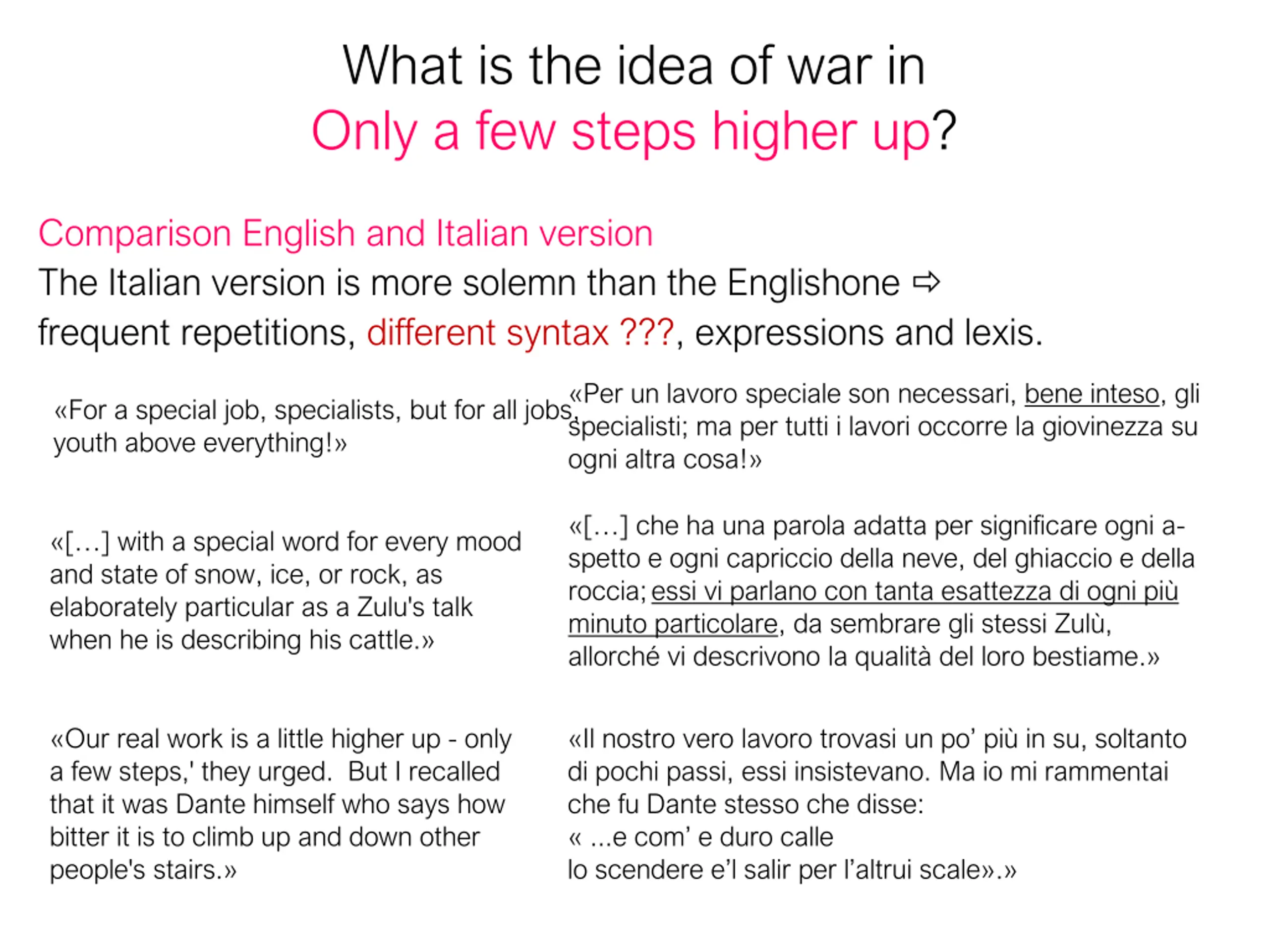 What is the idea of war in Only a few steps higher up? Comparison English and Italian version The Italian version is more solemn than the Englishone frequent repetitions, different syntax ???, expressions and lexis. Per un lavoro speciale son necessari, bene inteso, gli specialisti; ma per tutti i lavori occorre la giovinezza su ogni altra cosa! For a special job, specialists, but for all jobs, youth above everything! [ ] che ha una parola adatta per significare ogni a- spetto e ogni capriccio della neve, del ghiaccio e della roccia;essi vi parlano con tanta esattezza di ogni pi minuto particolare, da sembrare gli stessi Zul , allorch vi descrivono la qualit del loro bestiame. [ ] with a special word for every mood and state of snow, ice, or rock, as elaborately particular as a Zulu's talk when he is describing his cattle. Our real work is a little higher up - only a few steps,' they urged. But I recalled that it was Dante himself who says how bitter it is to climb up and down other people's stairs. Il nostro vero lavoro trovasi un po pi in su, soltanto di pochi passi, essi insistevano. Ma io mi rammentai che fu Dante stesso che disse: ...e com e duro calle lo scendere e l salir per l altrui scale .