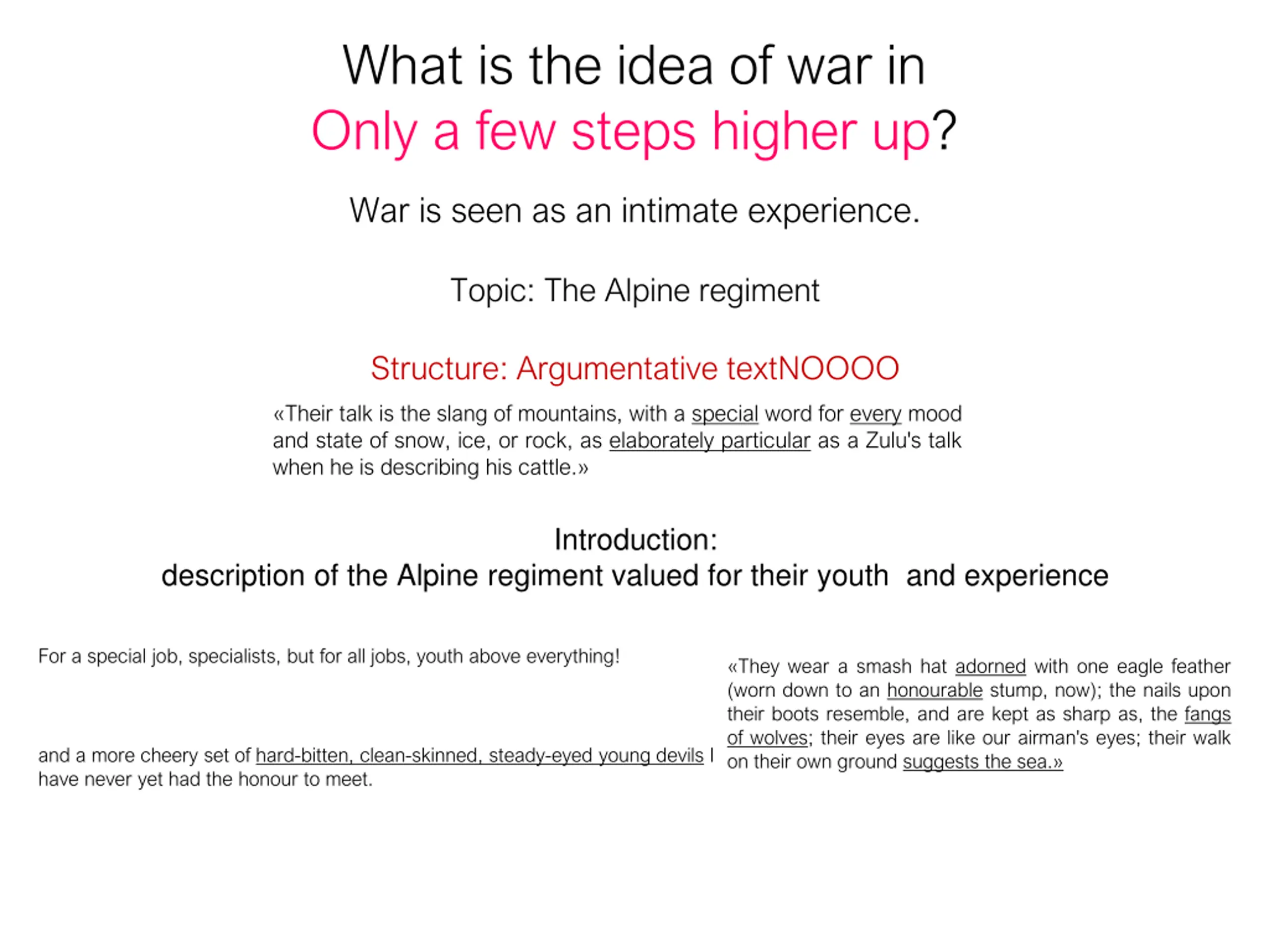 What is the idea of war in Only a few steps higher up? War is seen as an intimate experience. Topic: The Alpine regiment Structure: Argumentative textNOOOO Their talk is the slang of mountains, with a special word for every mood and state of snow, ice, or rock, as elaborately particular as a Zulu's talk when he is describing his cattle. Introduction: description of the Alpine regiment valued for their youth and experience For a special job, specialists, but for all jobs, youth above everything! They wear a smash hat adorned with one eagle feather (worn down to an honourable stump, now); the nails upon their boots resemble, and are kept as sharp as, the fangs of wolves; their eyes are like our airman's eyes; their walk on their own ground suggests the sea. and a more cheery set of hard-bitten, clean-skinned, steady-eyed young devils I have never yet had the honour to meet.