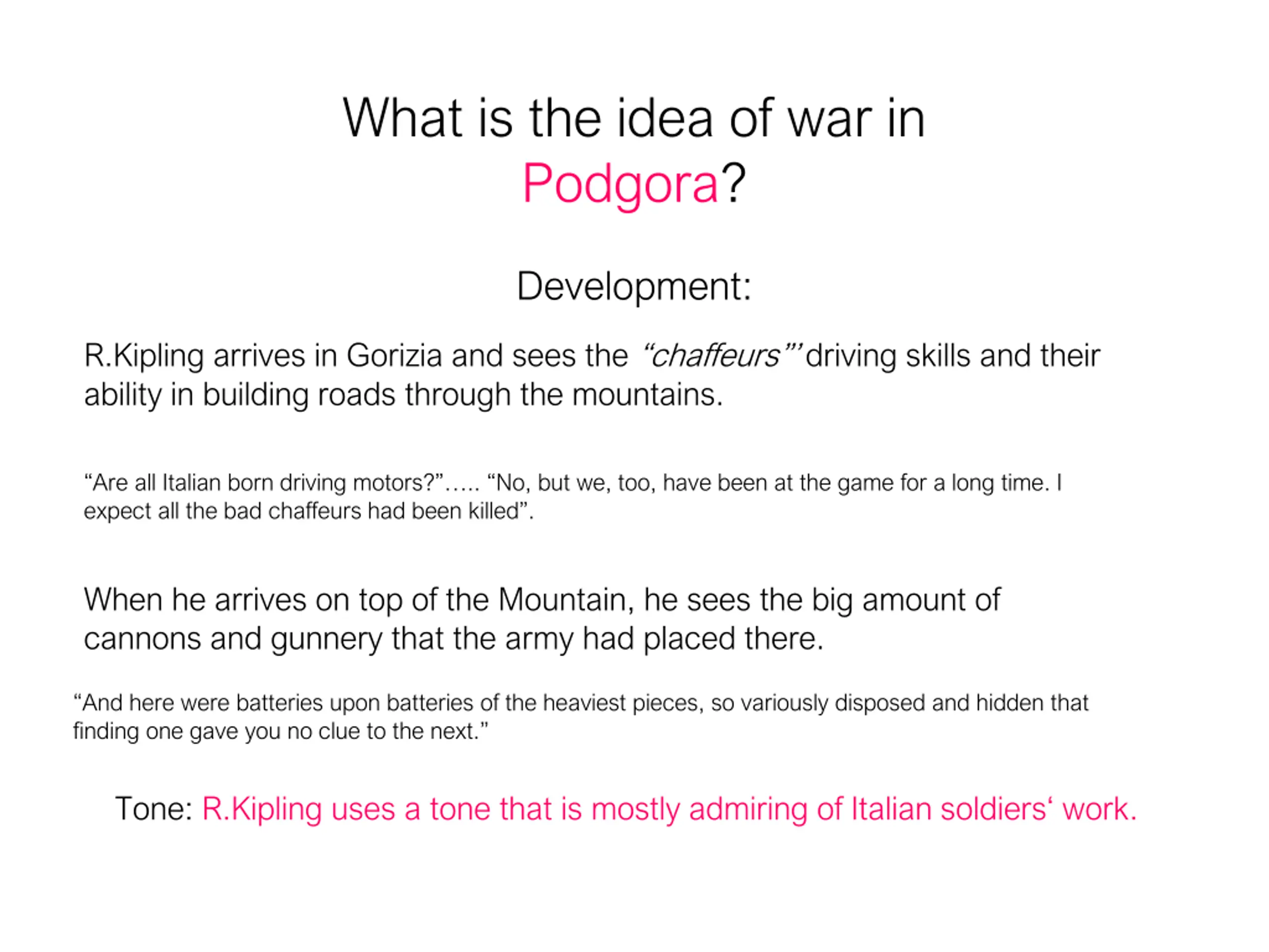 What is the idea of war in Podgora? Development: R.Kipling arrives in Gorizia and sees the chaffeurs driving skills and their ability in building roads through the mountains. Are all Italian born driving motors? .. No, but we, too, have been at the game for a long time. I expect all the bad chaffeurs had been killed . When he arrives on top of the Mountain, he sees the big amount of cannons and gunnery that the army had placed there. And here were batteries upon batteries of the heaviest pieces, so variously disposed and hidden that finding one gave you no clue to the next. Tone: R.Kipling uses a tone that is mostly admiring of Italian soldiers work.