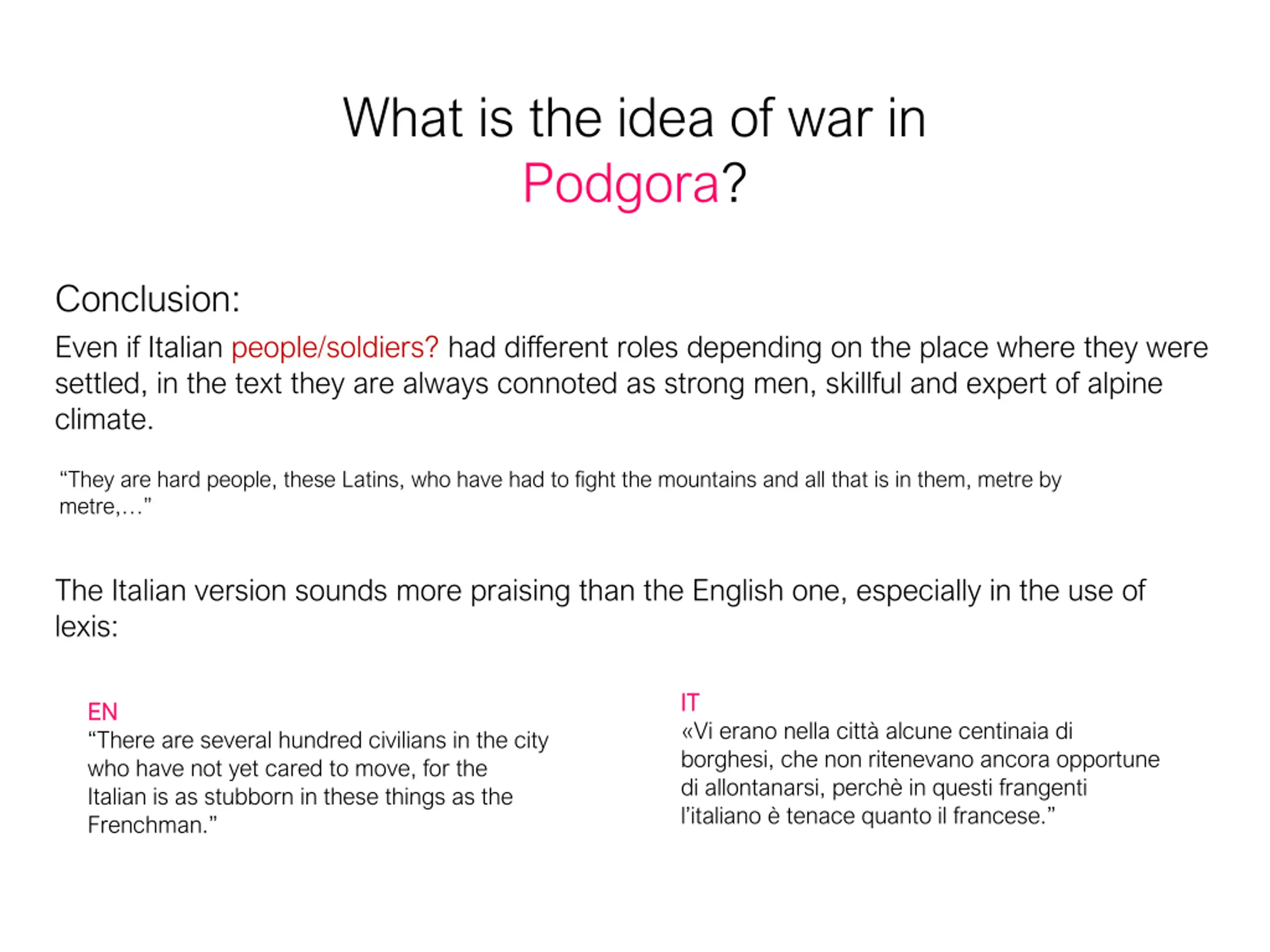 What is the idea of war in Podgora? Conclusion: Even if Italian people/soldiers? had different roles depending on the place where they were settled, in the text they are always connoted as strong men, skillful and expert of alpine climate. They are hard people, these Latins, who have had to fight the mountains and all that is in them, metre by metre, The Italian version sounds more praising than the English one, especially in the use of lexis: IT IT Vi erano nella citt alcune centinaia di borghesi, che non ritenevano ancora opportune di allontanarsi, perch in questi frangenti l italiano tenace quanto il francese. EN EN There are several hundred civilians in the city who have not yet cared to move, for the Italian is as stubborn in these things as the Frenchman.