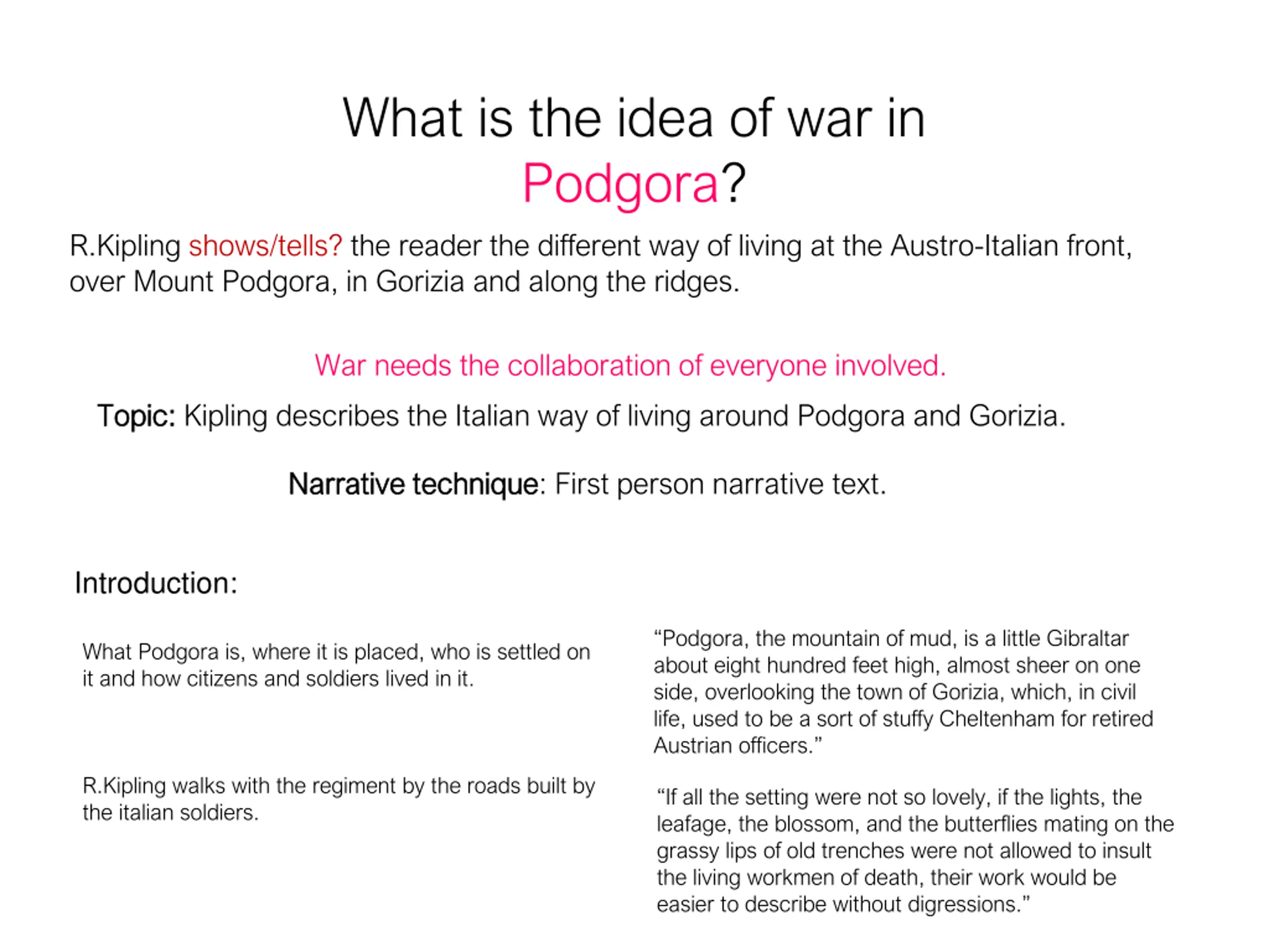 What is the idea of war in Podgora? R.Kipling shows/tells? the reader the different way of living at the Austro-Italian front, over Mount Podgora, in Gorizia and along the ridges. War needs the collaboration of everyone involved. Topic: Kipling describes the Italian way of living around Podgora and Gorizia. Topic: Narrative technique Narrative technique: First person narrative text. Introduction: Podgora, the mountain of mud, is a little Gibraltar about eight hundred feet high, almost sheer on one side, overlooking the town of Gorizia, which, in civil life, used to be a sort of stuffy Cheltenham for retired Austrian officers. What Podgora is, where it is placed, who is settled on it and how citizens and soldiers lived in it. R.Kipling walks with the regiment by the roads built by the italian soldiers. If all the setting were not so lovely, if the lights, the leafage, the blossom, and the butterflies mating on the grassy lips of old trenches were not allowed to insult the living workmen of death, their work would be easier to describe without digressions.