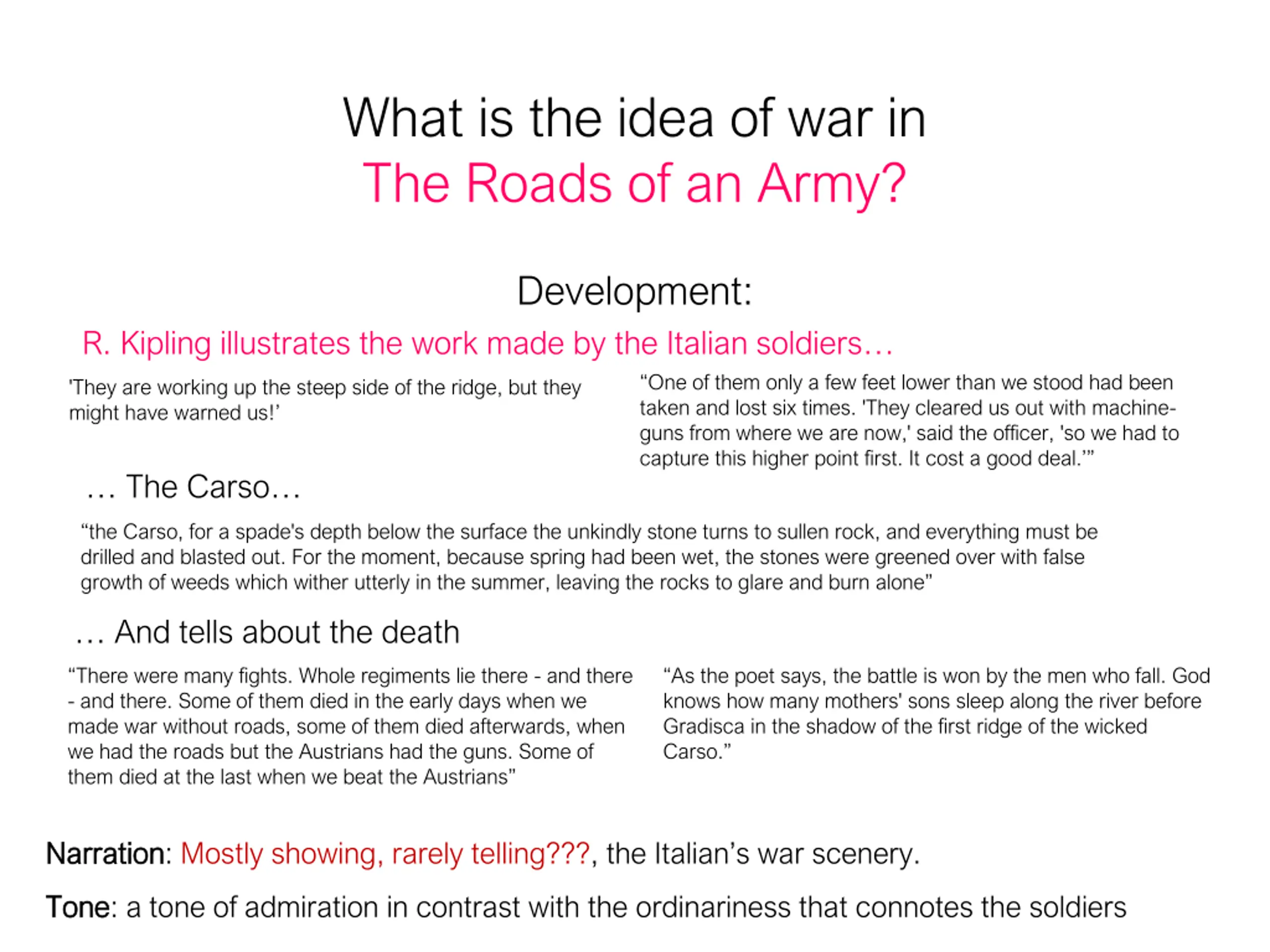 What is the idea of war in The Roads of an Army? Development: R. Kipling illustrates the work made by the Italian soldiers One of them only a few feet lower than we stood had been taken and lost six times. 'They cleared us out with machine- guns from where we are now,' said the officer, 'so we had to capture this higher point first. It cost a good deal. 'They are working up the steep side of the ridge, but they might have warned us! The Carso the Carso, for a spade's depth below the surface the unkindly stone turns to sullen rock, and everything must be drilled and blasted out. For the moment, because spring had been wet, the stones were greened over with false growth of weeds which wither utterly in the summer, leaving the rocks to glare and burn alone And tells about the death There were many fights. Whole regiments lie there - and there - and there. Some of them died in the early days when we made war without roads, some of them died afterwards, when we had the roads but the Austrians had the guns. Some of them died at the last when we beat the Austrians As the poet says, the battle is won by the men who fall. God knows how many mothers' sons sleep along the river before Gradisca in the shadow of the first ridge of the wicked Carso. Narration Narration: Mostly showing, rarely telling???, the Italian s war scenery. Tone Tone: a tone of admiration in contrast with the ordinariness that connotes the soldiers