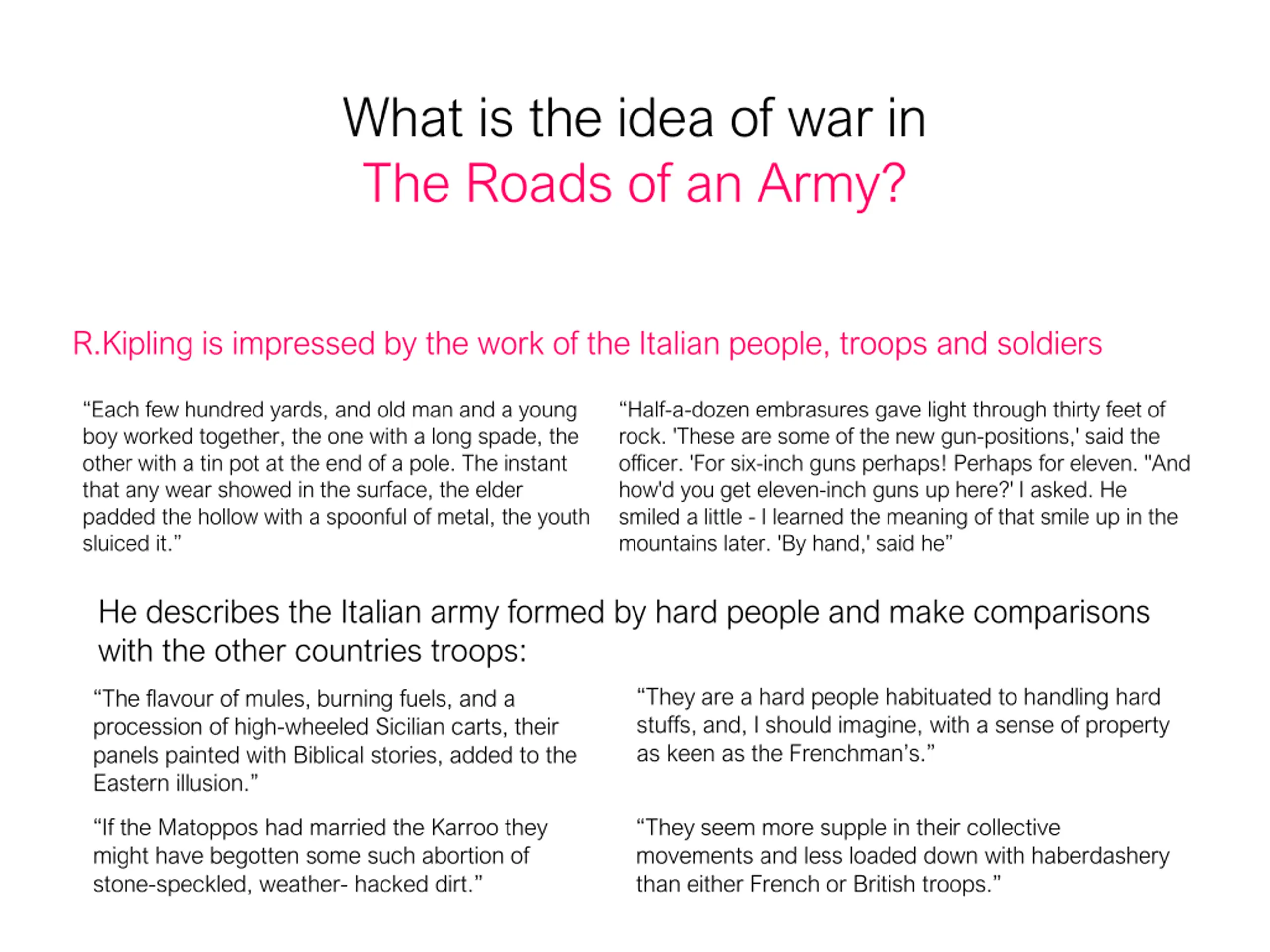 What is the idea of war in The Roads of an Army? R.Kipling is impressed by the work of the Italian people, troops and soldiers Each few hundred yards, and old man and a young boy worked together, the one with a long spade, the other with a tin pot at the end of a pole. The instant that any wear showed in the surface, the elder padded the hollow with a spoonful of metal, the youth sluiced it. Half-a-dozen embrasures gave light through thirty feet of rock. 'These are some of the new gun-positions,' said the officer. 'For six-inch guns perhaps! Perhaps for eleven. ''And how'd you get eleven-inch guns up here?' I asked. He smiled a little - I learned the meaning of that smile up in the mountains later. 'By hand,' said he He describes the Italian army formed by hard people and make comparisons with the other countries troops: They are a hard people habituated to handling hard stuffs, and, I should imagine, with a sense of property as keen as the Frenchman s. The flavour of mules, burning fuels, and a procession of high-wheeled Sicilian carts, their panels painted with Biblical stories, added to the Eastern illusion. If the Matoppos had married the Karroo they might have begotten some such abortion of stone-speckled, weather- hacked dirt. They seem more supple in their collective movements and less loaded down with haberdashery than either French or British troops.