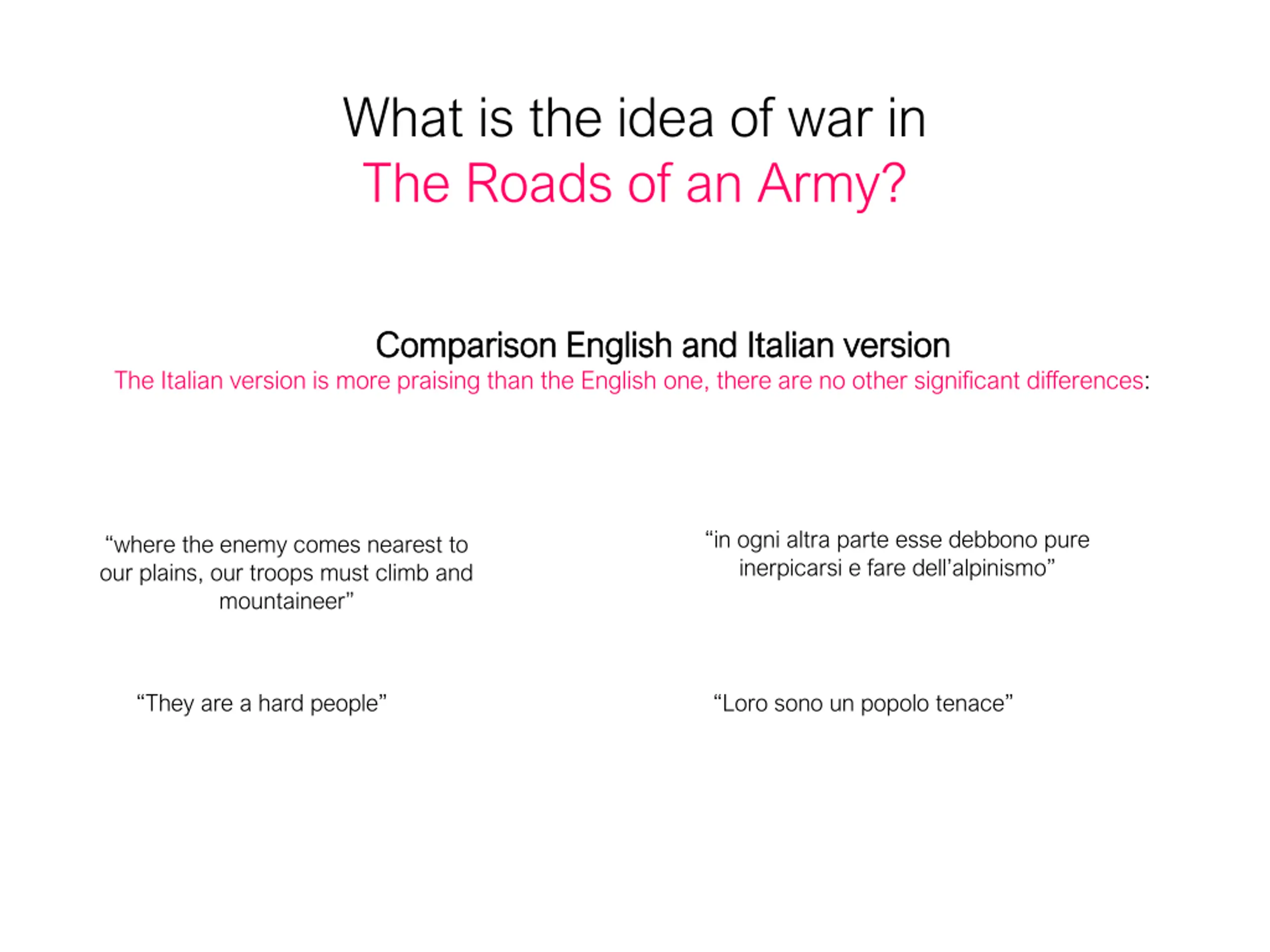 What is the idea of war in The Roads of an Army? Comparison Comparison English and English and Italian version Italian version The Italian version is more praising than the English one, there are no other significant differences: in ogni altra parte esse debbono pure inerpicarsi e fare dell alpinismo where the enemy comes nearest to our plains, our troops must climb and mountaineer They are a hard people Loro sono un popolo tenace