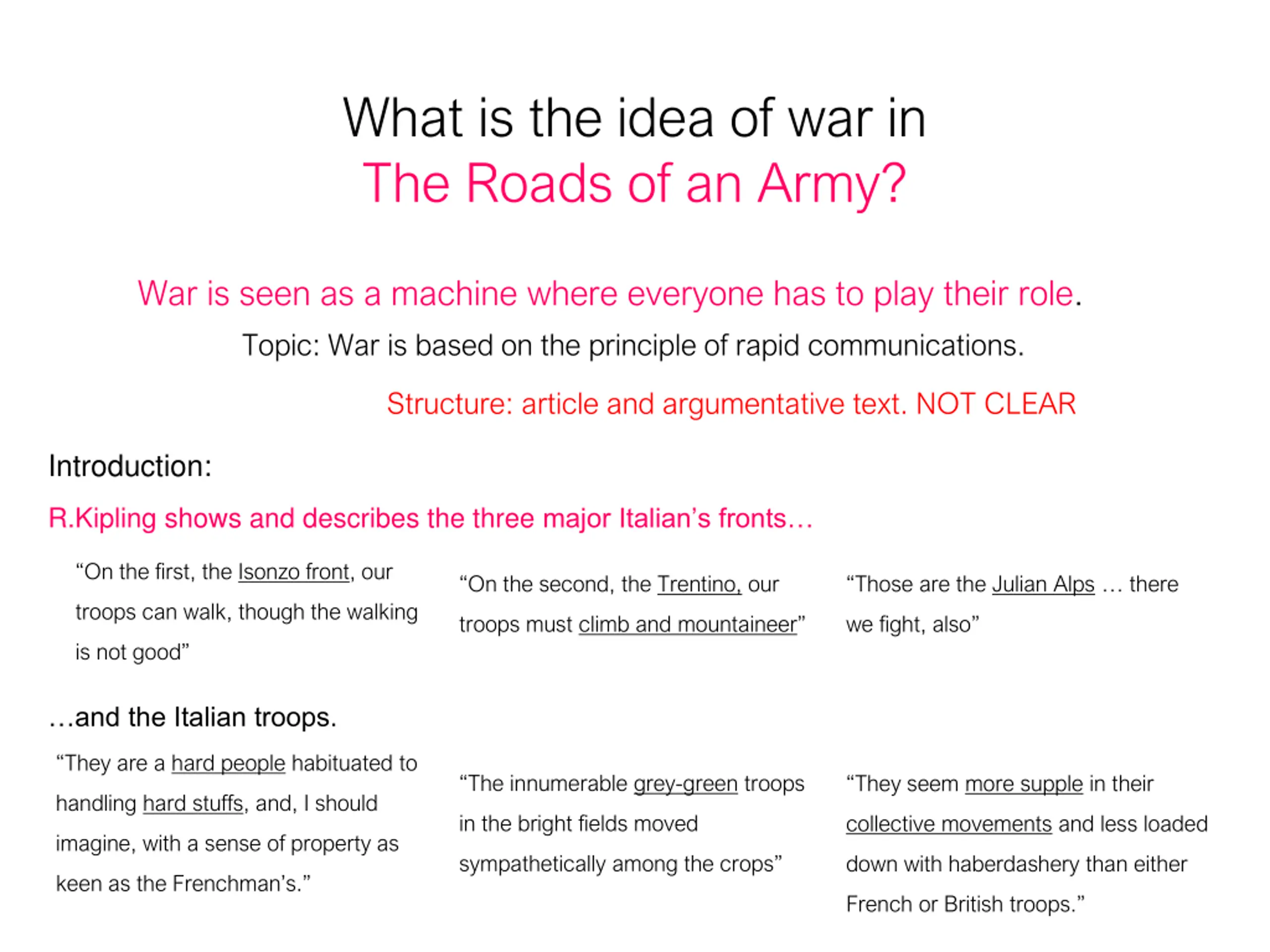 What is the idea of war in The Roads of an Army? War is seen as a machine where everyone has to play their role. Topic: War is based on the principle of rapid communications. Structure: article and argumentative text. NOT CLEAR Introduction: R.Kipling shows and describes the three major Italian s fronts On the first, the Isonzo front, our On the second, the Trentino, our Those are the Julian Alps there troops can walk, though the walking troops must climb and mountaineer we fight, also is not good and the Italian troops. They are a hard people habituated to The innumerable grey-green troops They seem more supple in their handling hard stuffs, and, I should in the bright fields moved collective movements and less loaded imagine, with a sense of property as sympathetically among the crops down with haberdashery than either keen as the Frenchman s. French or British troops.