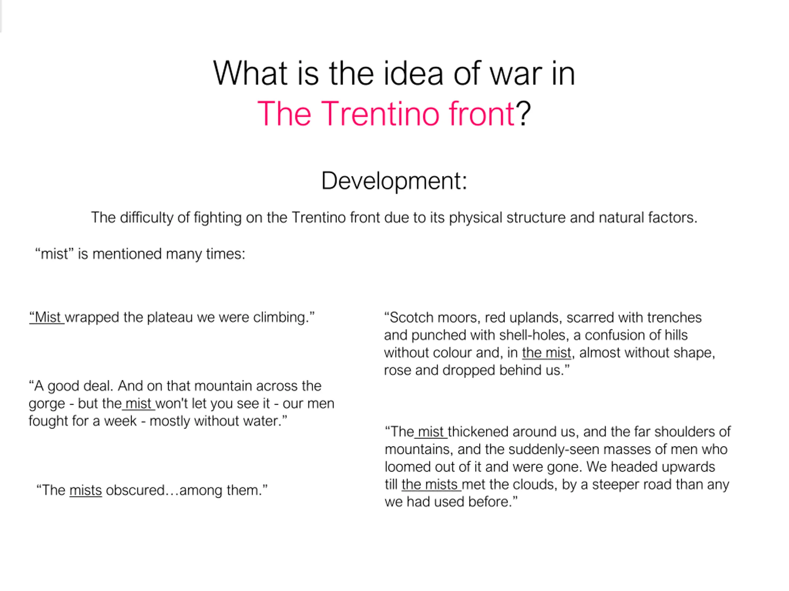 What is the idea of war in The Trentino front? Development: The difficulty of fighting on the Trentino front due to its physical structure and natural factors. mist is mentioned many times: Mist wrapped the plateau we were climbing. Scotch moors, red uplands, scarred with trenches and punched with shell-holes, a confusion of hills without colour and, in the mist, almost without shape, rose and dropped behind us. A good deal. And on that mountain across the gorge - but the mist won't let you see it - our men fought for a week - mostly without water. The mist thickened around us, and the far shoulders of mountains, and the suddenly-seen masses of men who loomed out of it and were gone. We headed upwards till the mists met the clouds, by a steeper road than any we had used before. The mists obscured among them.