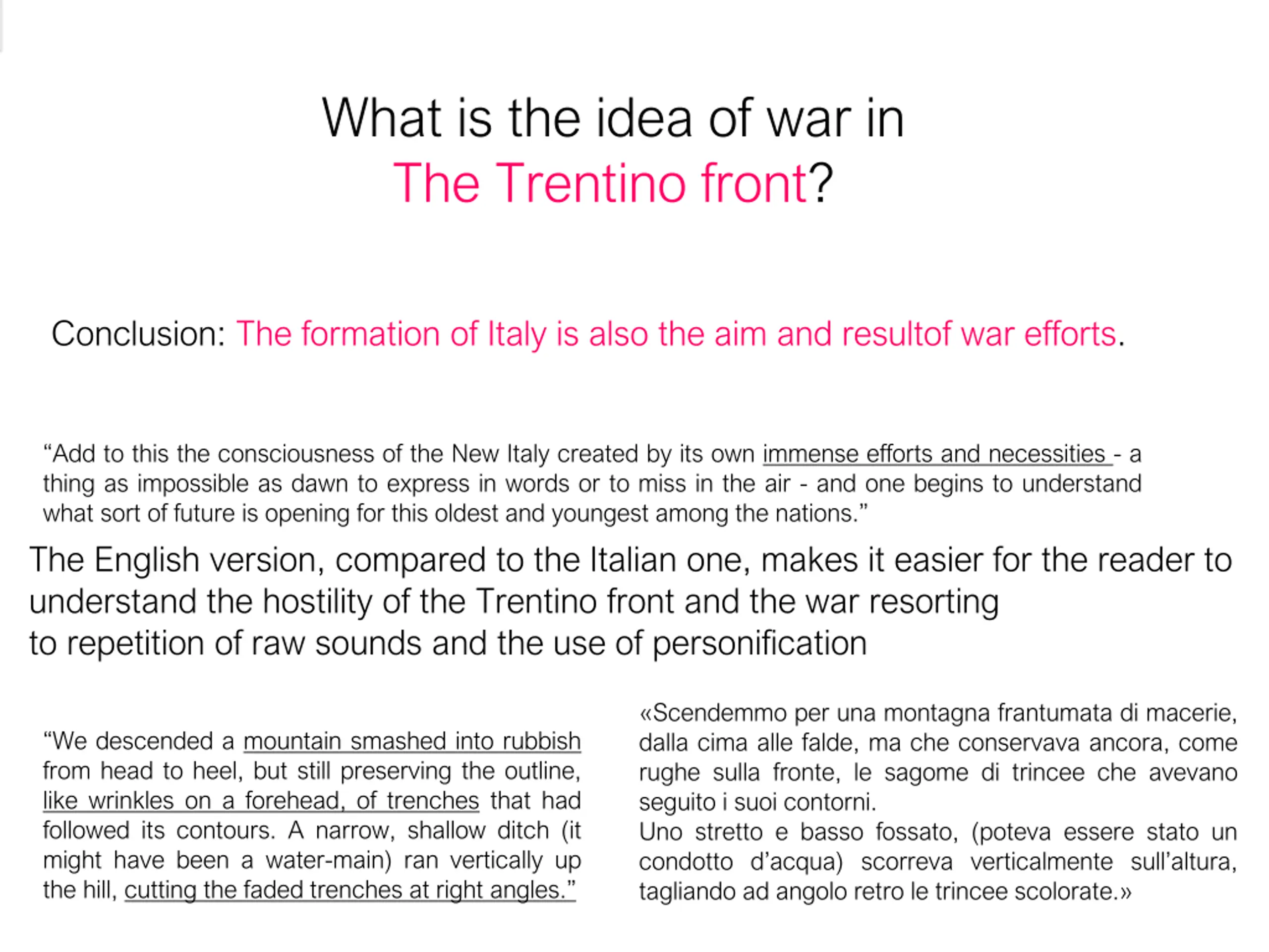 What is the idea of war in The Trentino front? Conclusion: The formation of Italy is also the aim and resultof war efforts. Add to this the consciousness of the New Italy created by its own immense efforts and necessities - a thing as impossible as dawn to express in words or to miss in the air - and one begins to understand what sort of future is opening for this oldest and youngest among the nations. The English version, compared to the Italian one, makes it easier for the reader to understand the hostility of the Trentino front and the war resorting to repetition of raw sounds and the use of personification Scendemmo per una montagna frantumata di macerie, dalla cima alle falde, ma che conservava ancora, come rughe sulla fronte, le sagome di trincee che avevano seguito i suoi contorni. Uno stretto e basso fossato, (poteva essere stato un condotto d acqua) scorreva verticalmente sull altura, tagliando ad angolo retro le trincee scolorate. We descended a mountain smashed into rubbish from head to heel, but still preserving the outline, like wrinkles on a forehead, of trenches that had followed its contours. A narrow, shallow ditch (it might have been a water-main) ran vertically up the hill, cutting the faded trenches at right angles.