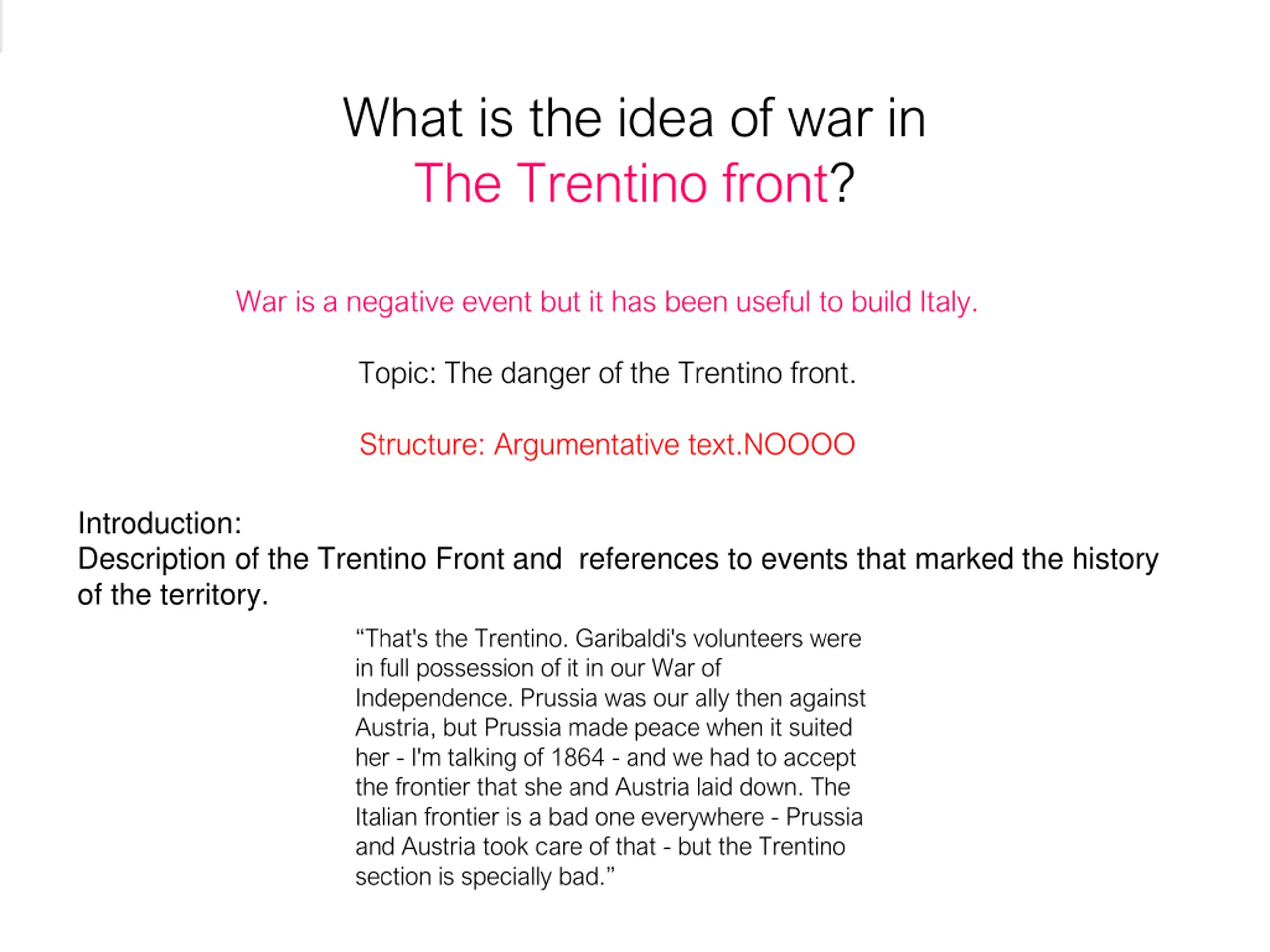 What is the idea of war in The Trentino front? War is a negative event but it has been useful to build Italy. Topic: The danger of the Trentino front. Structure: Argumentative text.NOOOO Introduction: Description of the Trentino Front and references to events that marked the history of the territory. That's the Trentino. Garibaldi's volunteers were in full possession of it in our War of Independence. Prussia was our ally then against Austria, but Prussia made peace when it suited her - I'm talking of 1864 - and we had to accept the frontier that she and Austria laid down. The Italian frontier is a bad one everywhere - Prussia and Austria took care of that - but the Trentino section is specially bad.