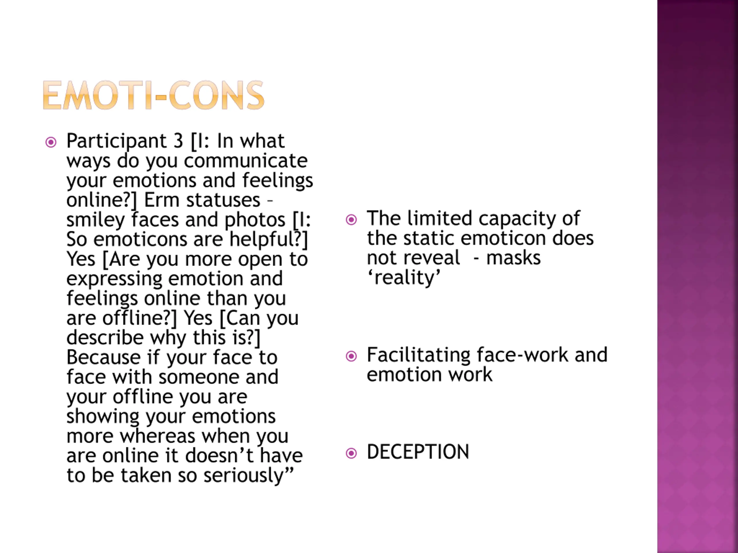 EMOTI-CONS Participant 3 [I: In what ways do you communicate your emotions and feelings online?] Erm statuses smiley faces and photos [I: So emoticons are helpful?] Yes [Are you more open to expressing emotion and feelings online than you are offline?] Yes [Can you describe why this is?] Because if your face to face with someone and your offline you are showing your emotions more whereas when you are online it doesn t have to be taken so seriously The limited capacity of the static emoticon does not reveal - masks reality Facilitating face-work and emotion work DECEPTION