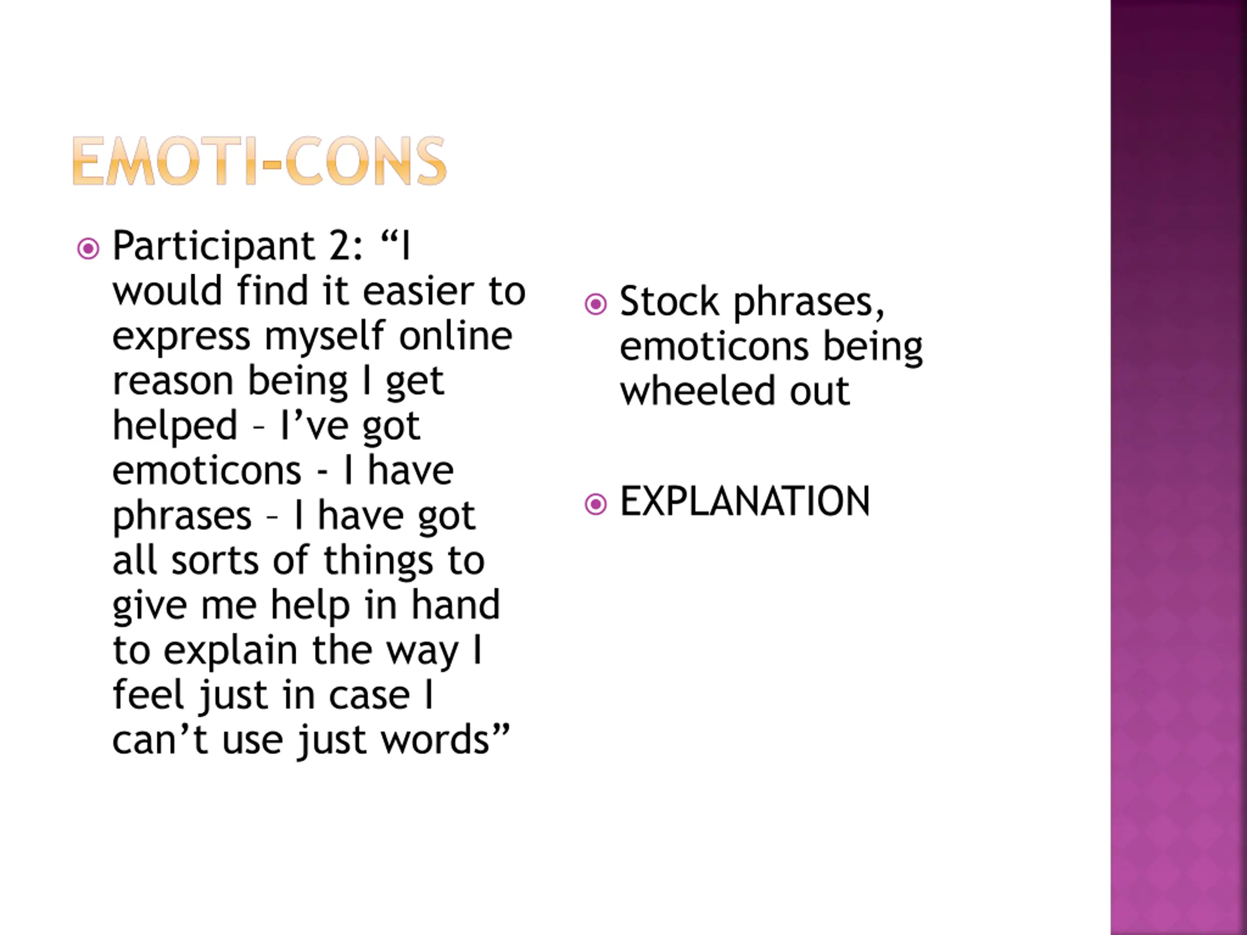 EMOTI-CONS Participant 2: I would find it easier to express myself online reason being I get helped I ve got emoticons - I have phrases I have got all sorts of things to give me help in hand to explain the way I feel just in case I can t use just words Stock phrases, emoticons being wheeled out EXPLANATION