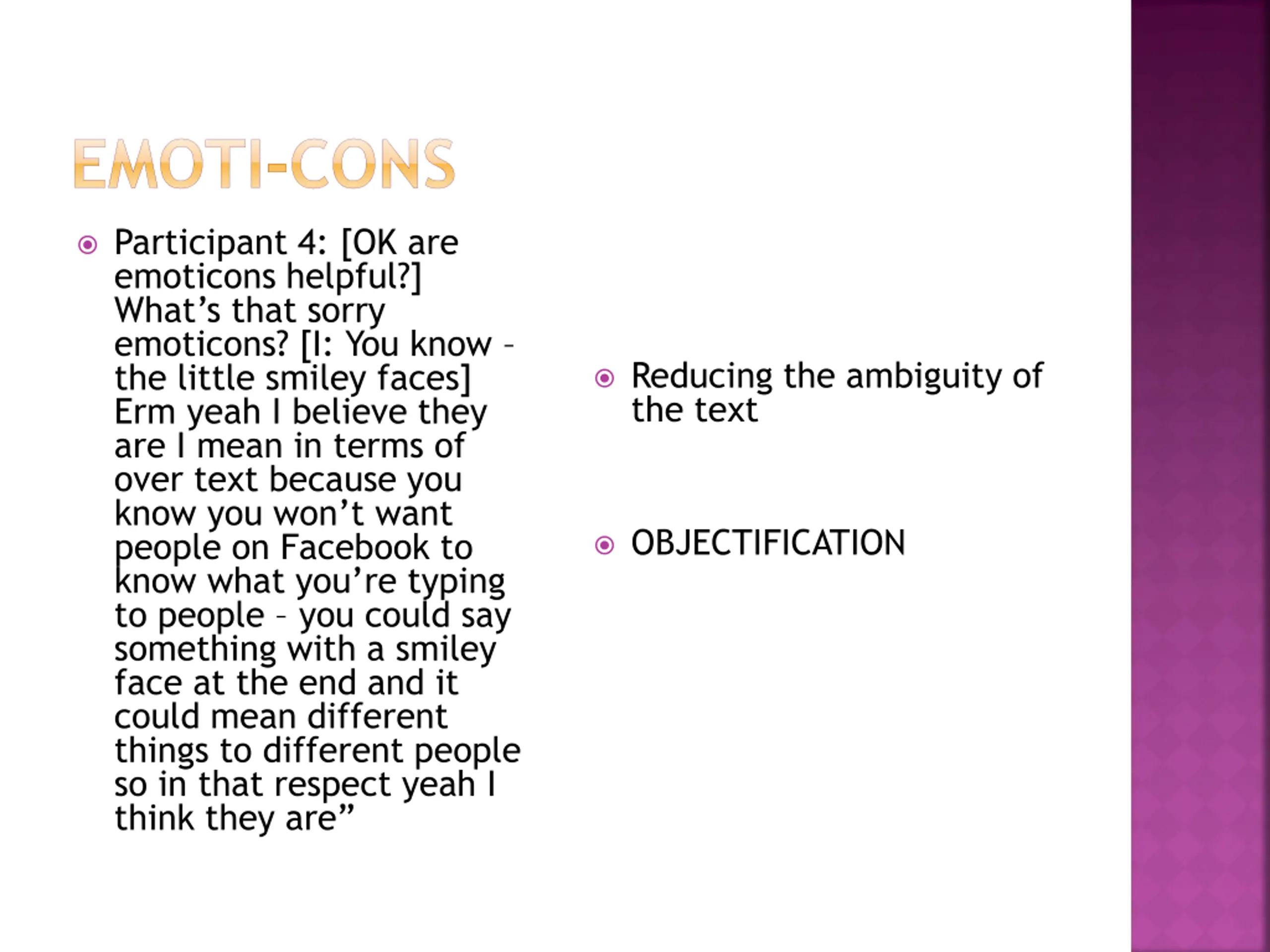 EMOTI-CONS Participant 4: [OK are emoticons helpful?] What s that sorry emoticons? [I: You know the little smiley faces] Erm yeah I believe they are I mean in terms of over text because you know you won t want people on Facebook to know what you re typing to people you could say something with a smiley face at the end and it could mean different things to different people so in that respect yeah I think they are Reducing the ambiguity of the text OBJECTIFICATION