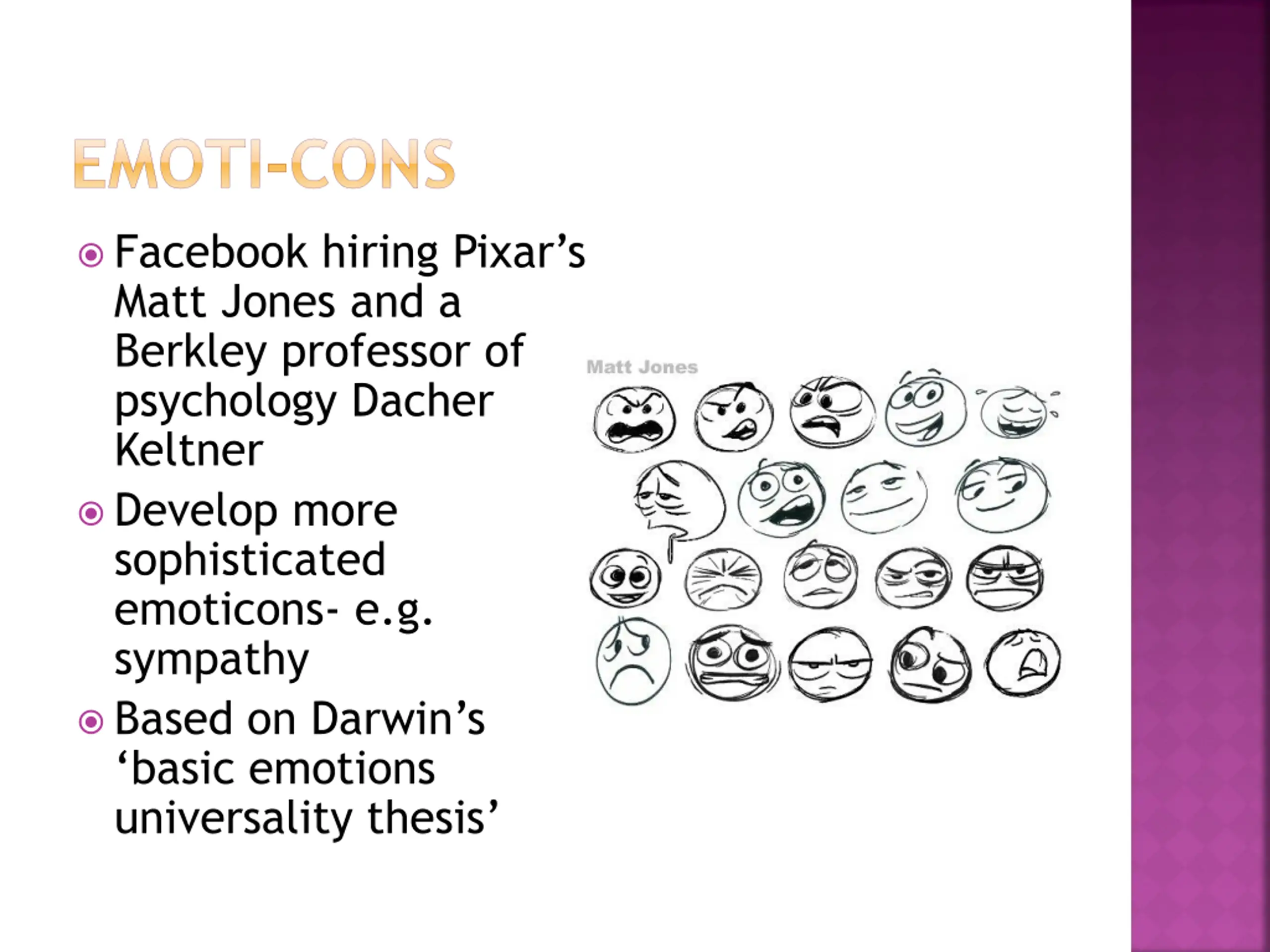 EMOTI-CONS Facebook hiring Pixar s Matt Jones and a Berkley professor of psychology Dacher Keltner Develop more sophisticated emoticons- e.g. sympathy Based on Darwin s basic emotions universality thesis