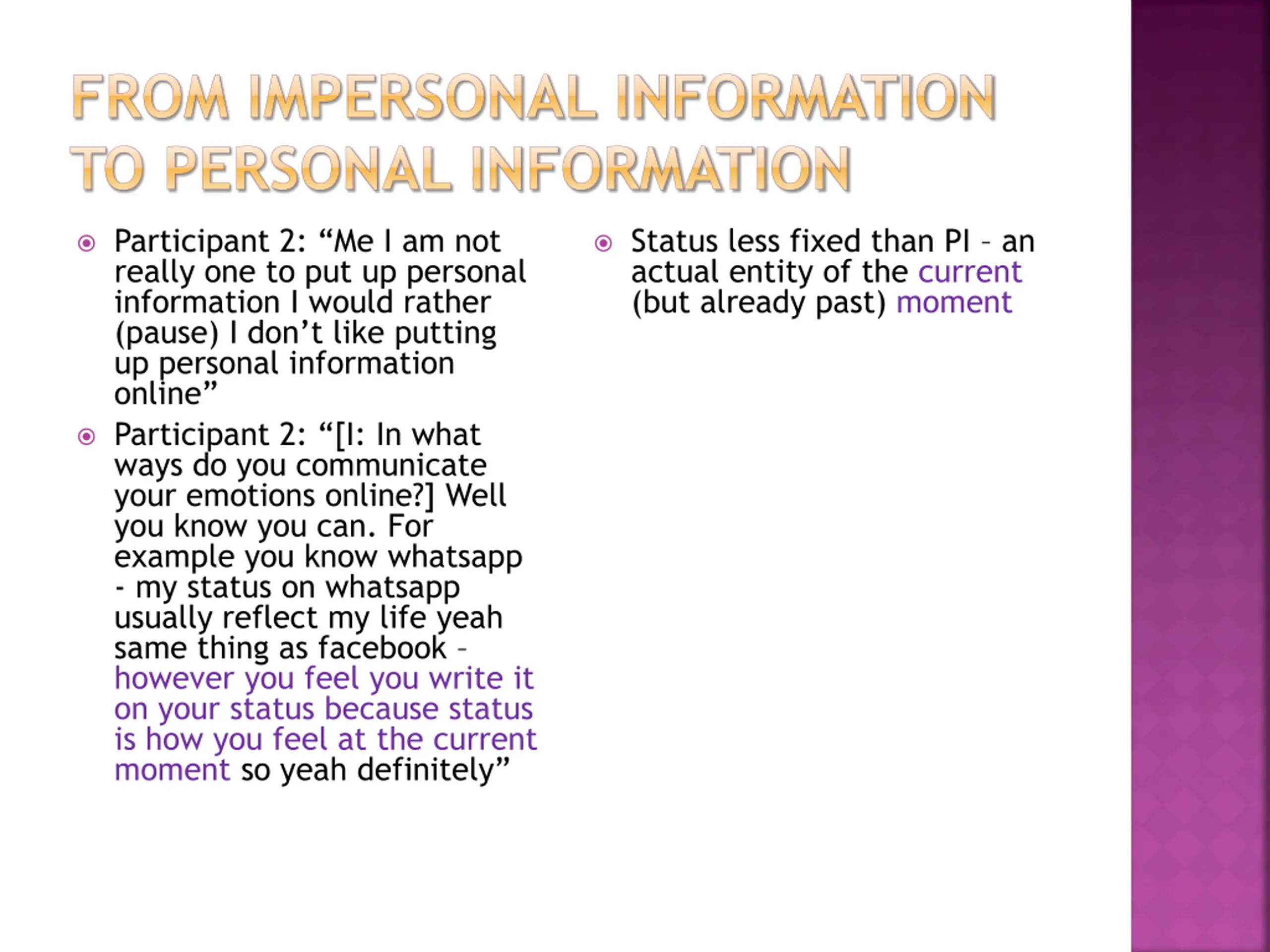 FROM IMPERSONAL INFORMATION TO PERSONAL INFORMATION Participant 2: Me I am not really one to put up personal information I would rather (pause) I don t like putting up personal information online Participant 2: [I: In what ways do you communicate your emotions online?] Well you know you can. For example you know whatsapp - my status on whatsapp usually reflect my life yeah same thing as facebook however you feel you write it on your status because status is how you feel at the current moment so yeah definitely Status less fixed than PI an actual entity of the current (but already past) moment