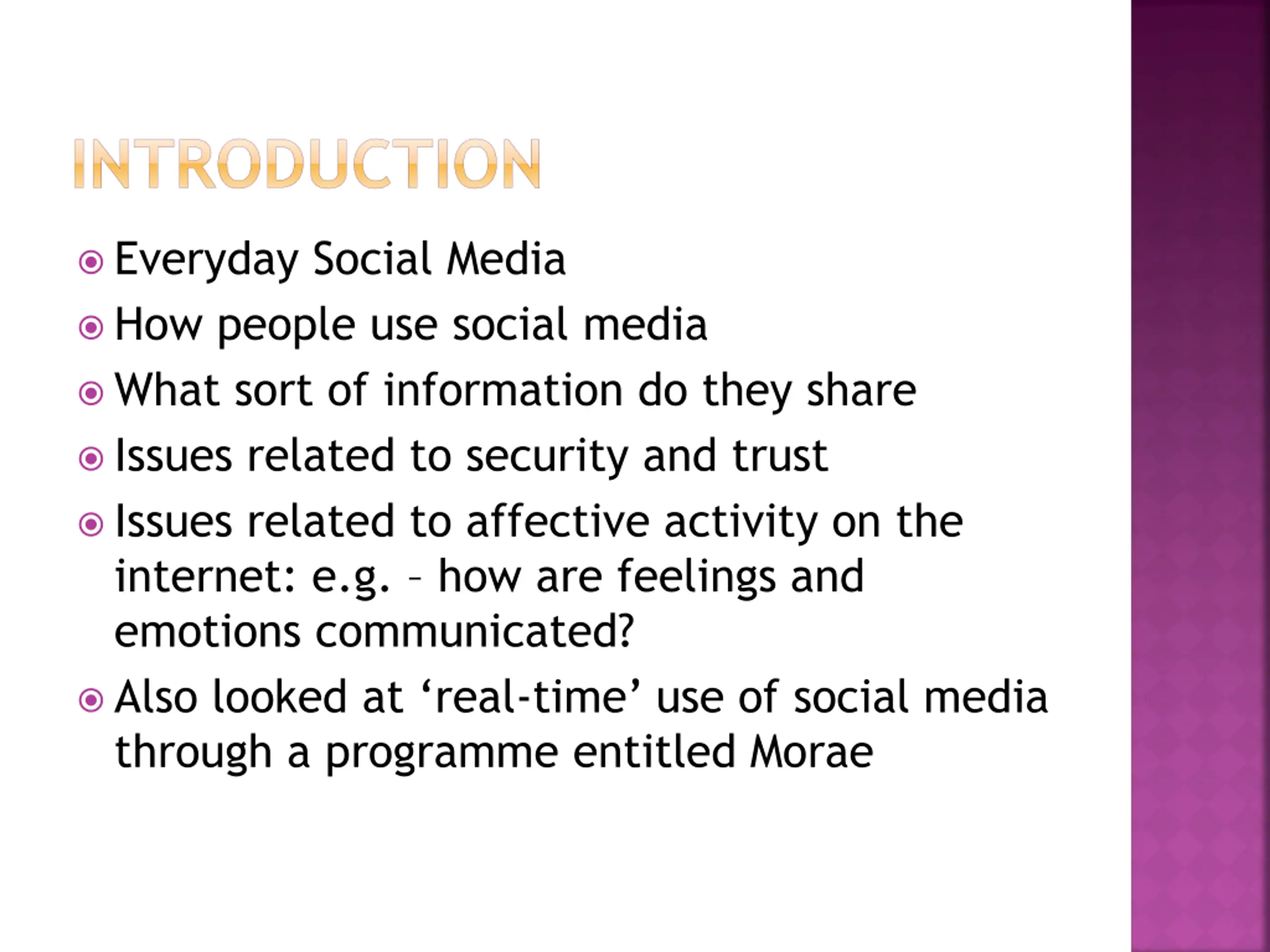 INTRODUCTION Everyday Social Media How people use social media What sort of information do they share Issues related to security and trust Issues related to affective activity on the internet: e.g. how are feelings and emotions communicated? Also looked at real-time use of social media through a programme entitled Morae