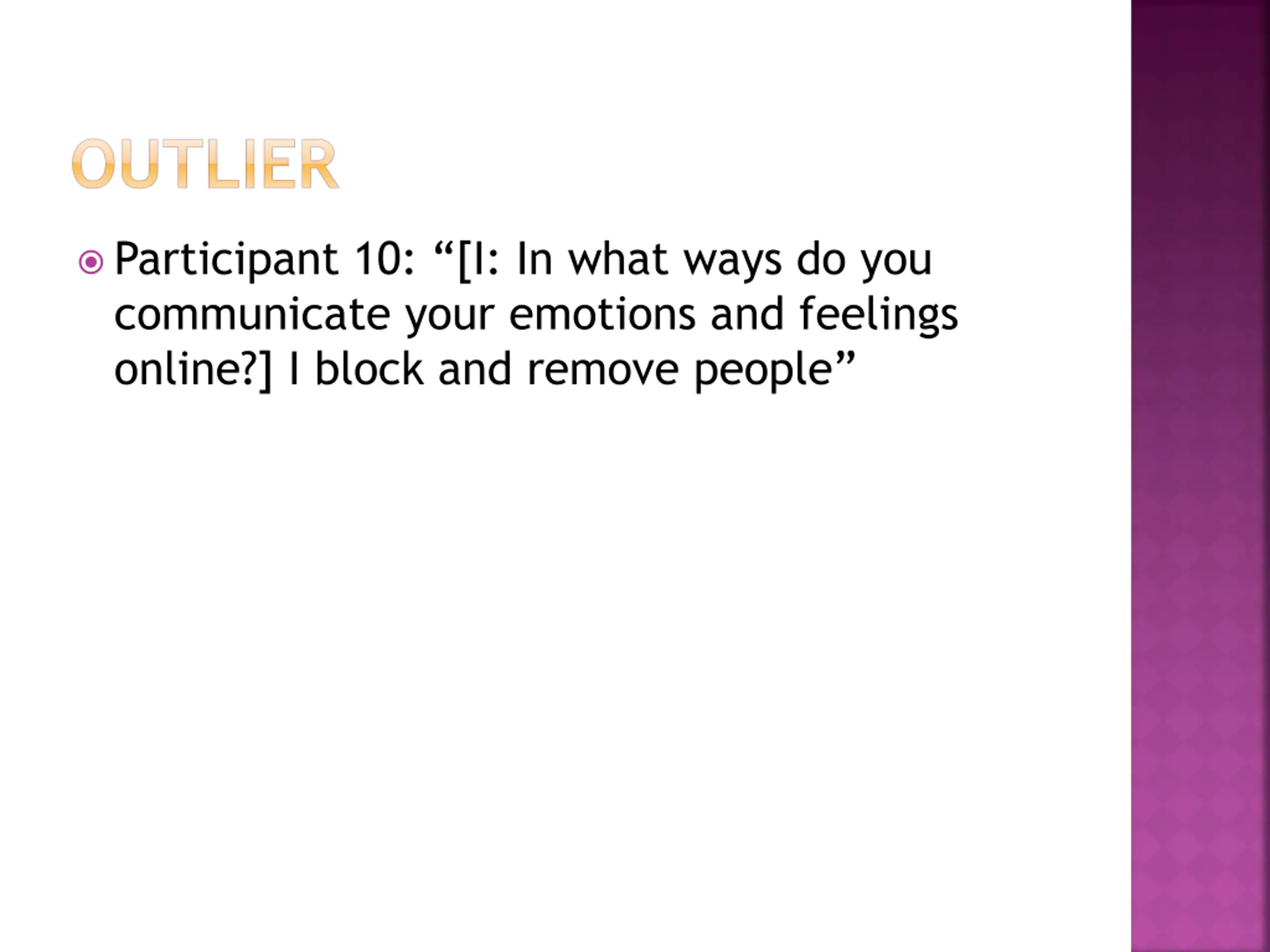 OUTLIER Participant 10: [I: In what ways do you communicate your emotions and feelings online?] I block and remove people