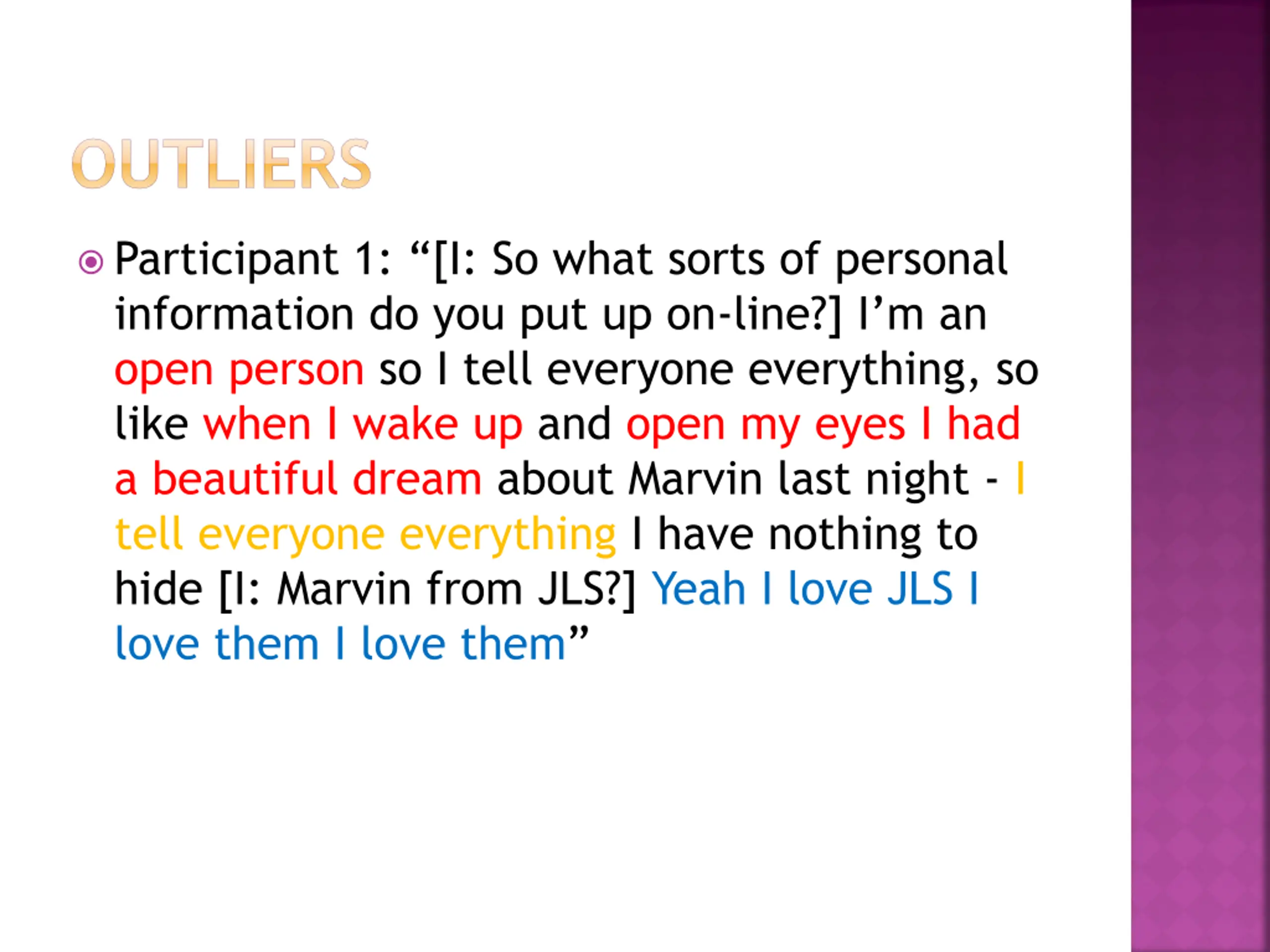 OUTLIERS Participant 1: [I: So what sorts of personal information do you put up on-line?] I m an open person so I tell everyone everything, so like when I wake up and open my eyes I had a beautiful dream about Marvin last night - I tell everyone everything I have nothing to hide [I: Marvin from JLS?] Yeah I love JLS I love them I love them