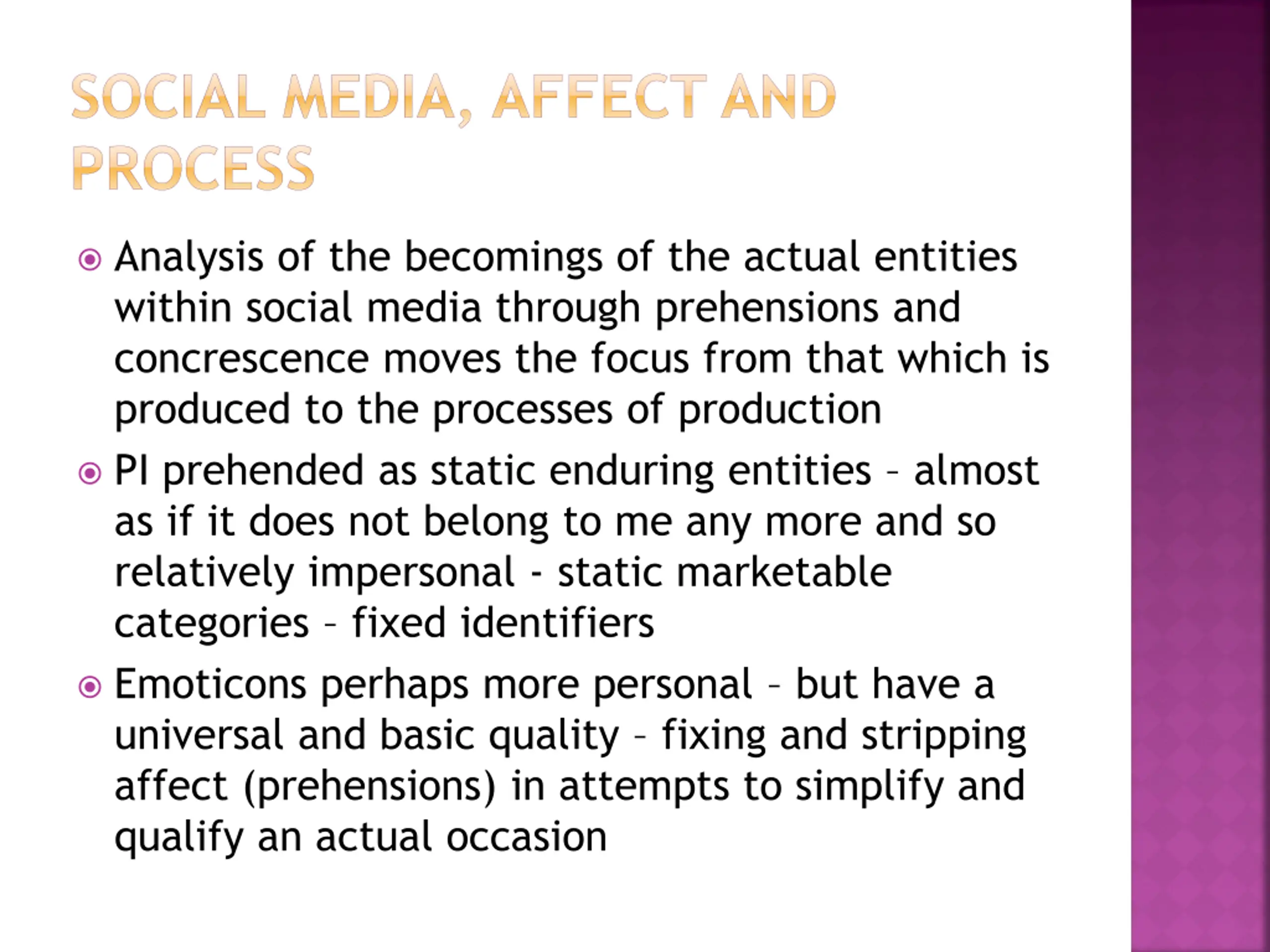 SOCIAL MEDIA, AFFECT AND PROCESS Analysis of the becomings of the actual entities within social media through prehensions and concrescence moves the focus from that which is produced to the processes of production PI prehended as static enduring entities almost as if it does not belong to me any more and so relatively impersonal - static marketable categories fixed identifiers Emoticons perhaps more personal but have a universal and basic quality fixing and stripping affect (prehensions) in attempts to simplify and qualify an actual occasion
