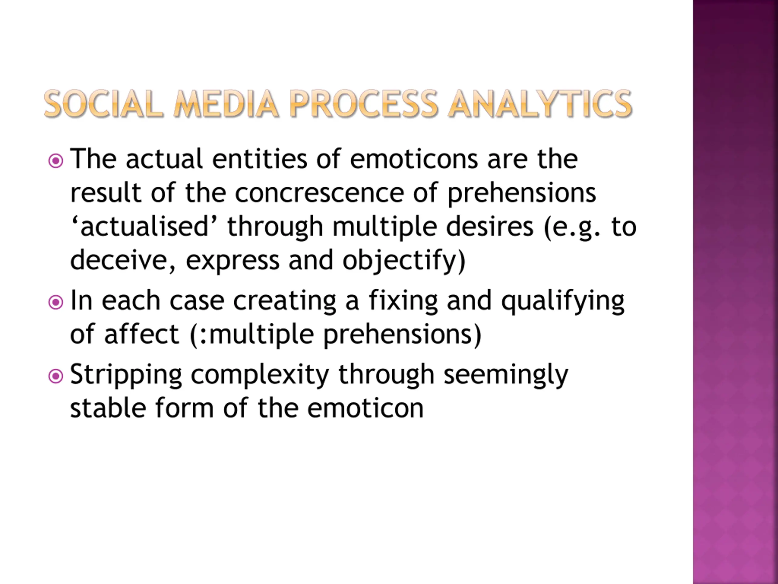 SOCIAL MEDIA PROCESS ANALYTICS The actual entities of emoticons are the result of the concrescence of prehensions actualised through multiple desires (e.g. to deceive, express and objectify) In each case creating a fixing and qualifying of affect (:multiple prehensions) Stripping complexity through seemingly stable form of the emoticon