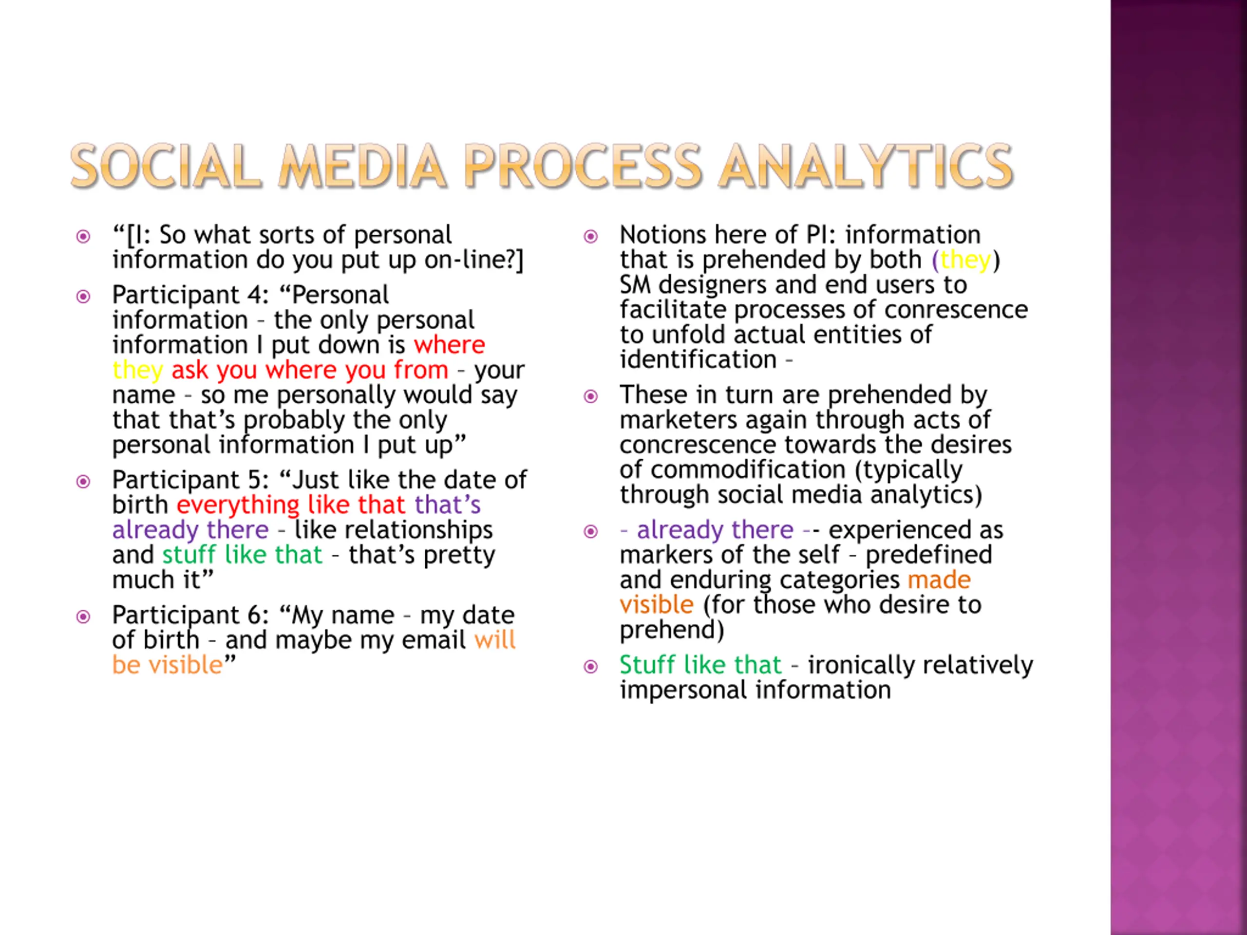 SOCIAL MEDIA PROCESS ANALYTICS [I: So what sorts of personal information do you put up on-line?] Participant 4: Personal information the only personal information I put down is where they ask you where you from your name so me personally would say that that s probably the only personal information I put up Participant 5: Just like the date of birth everything like that that s already there like relationships and stuff like that that s pretty much it Participant 6: My name my date of birth and maybe my email will be visible Notions here of PI: information that is prehended by both (they) SM designers and end users to facilitate processes of conrescence to unfold actual entities of identification These in turn are prehended by marketers again through acts of concrescence towards the desires of commodification (typically through social media analytics) already there - experienced as markers of the self predefined and enduring categories made visible (for those who desire to prehend) Stuff like that ironically relatively impersonal information