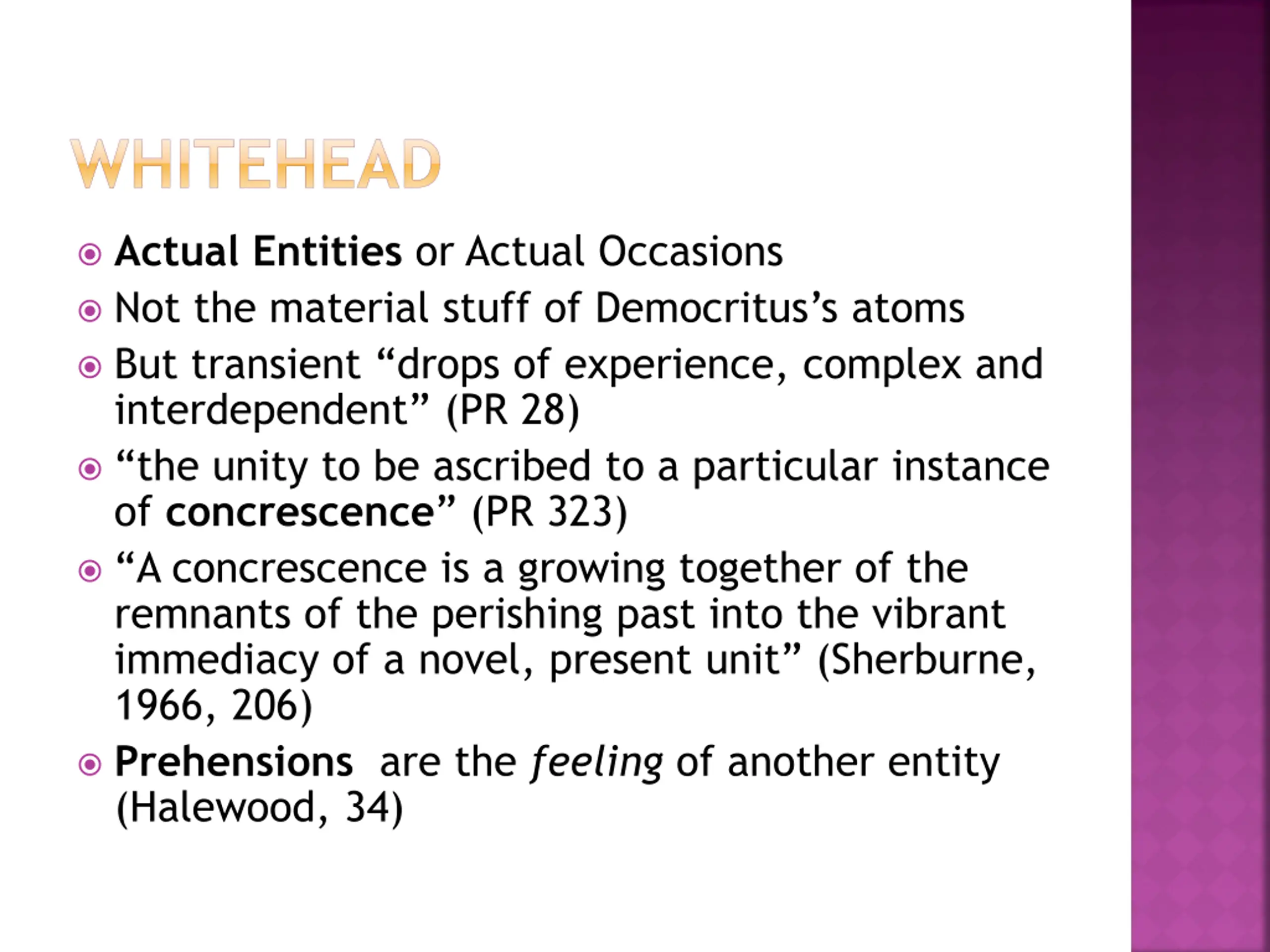 WHITEHEAD Actual Entities or Actual Occasions Not the material stuff of Democritus s atoms But transient drops of experience, complex and interdependent (PR 28) the unity to be ascribed to a particular instance of concrescence (PR 323) A concrescence is a growing together of the remnants of the perishing past into the vibrant immediacy of a novel, present unit (Sherburne, 1966, 206) Prehensions are the feeling of another entity (Halewood, 34)