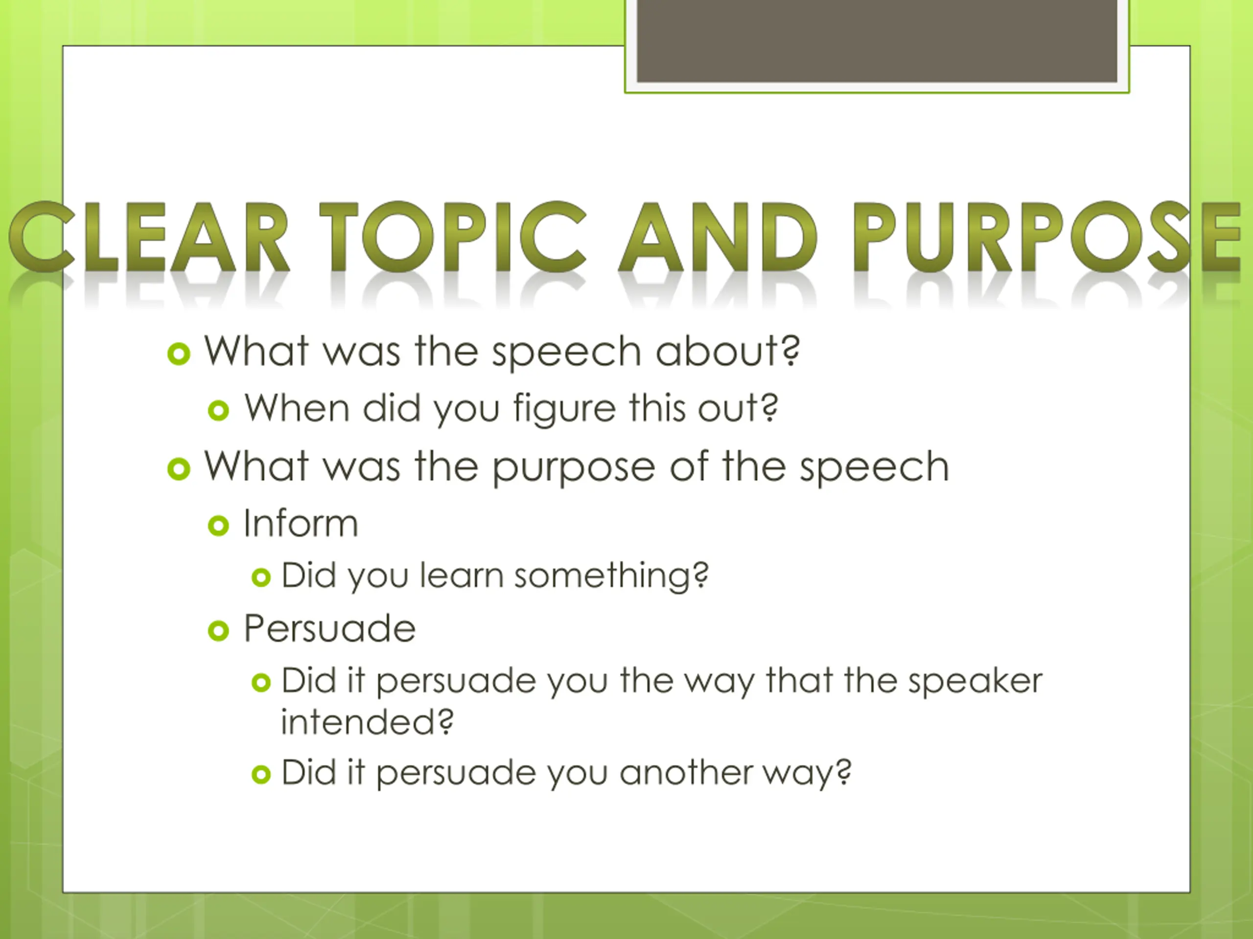 CLEAR TOPIC AND PURPOSE What was the speech about? When did you figure this out? What was the purpose of the speech Inform Did you learn something? Persuade Did it persuade you the way that the speaker intended? Did it persuade you another way?