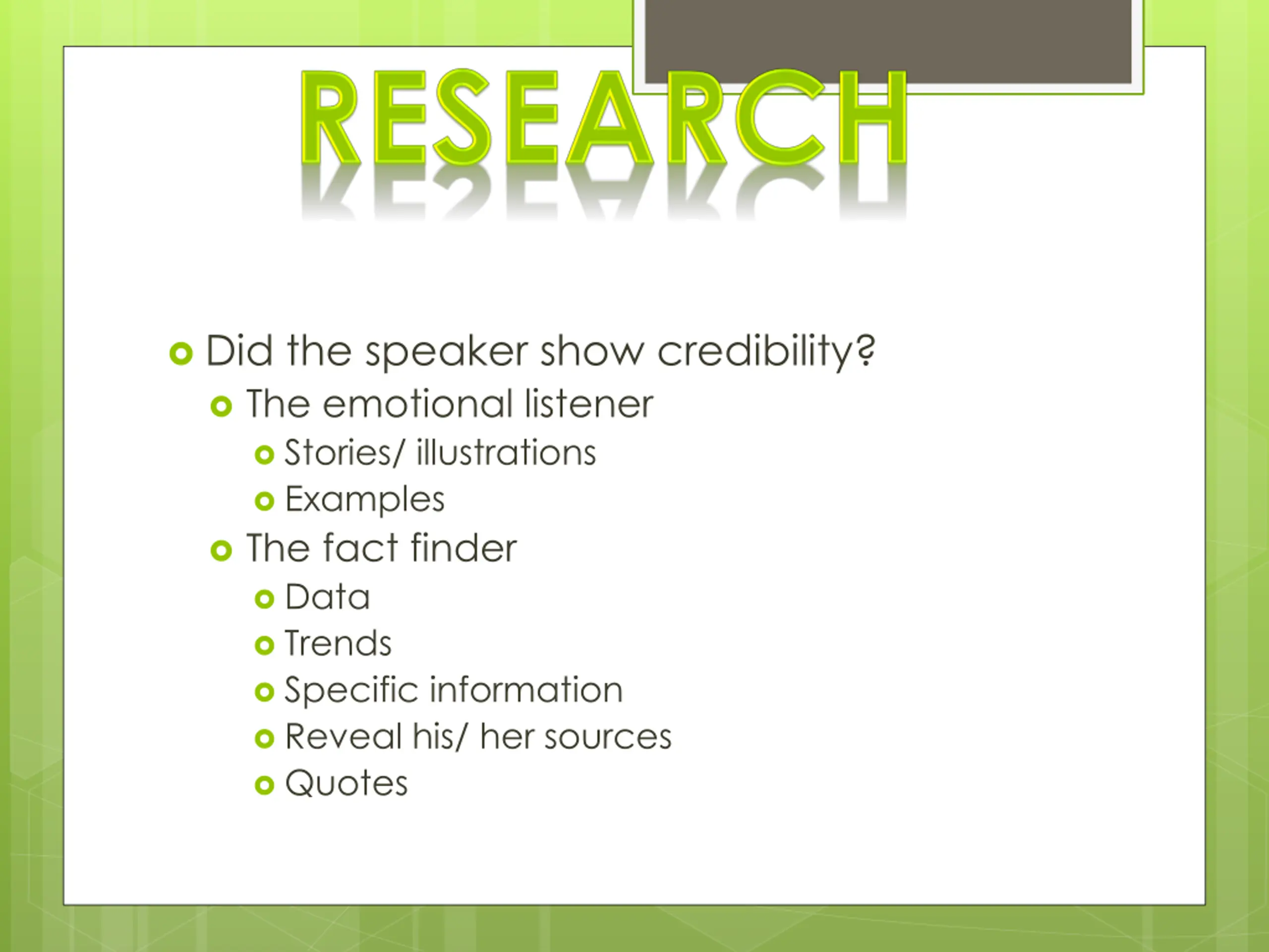 Did the speaker show credibility? The emotional listener Stories/ illustrations Examples The fact finder Data Trends Specific information Reveal his/ her sources Quotes