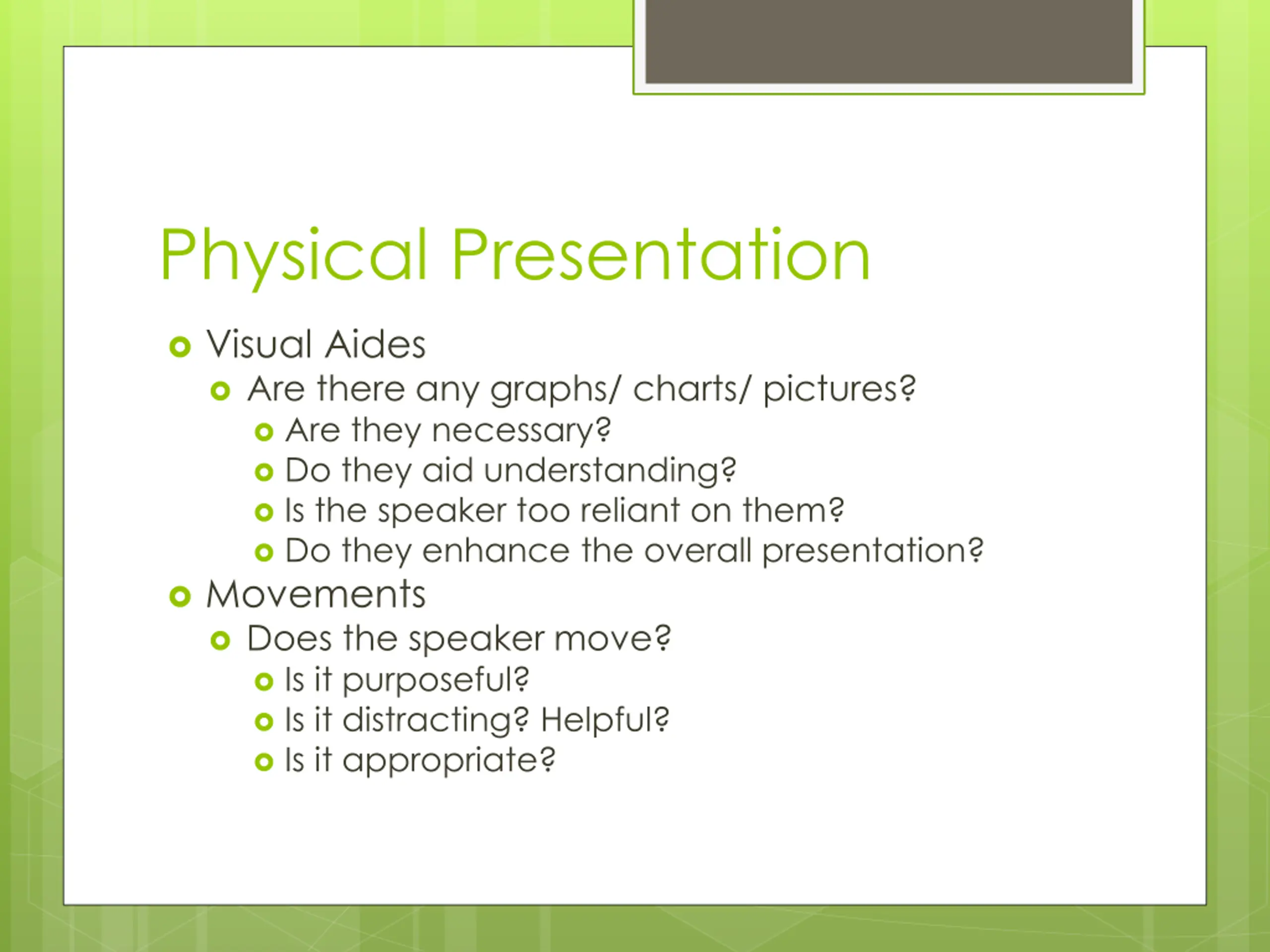 Physical Presentation Visual Aides Are there any graphs/ charts/ pictures? Are they necessary? Do they aid understanding? Is the speaker too reliant on them? Do they enhance the overall presentation? Movements Does the speaker move? Is it purposeful? Is it distracting? Helpful? Is it appropriate?