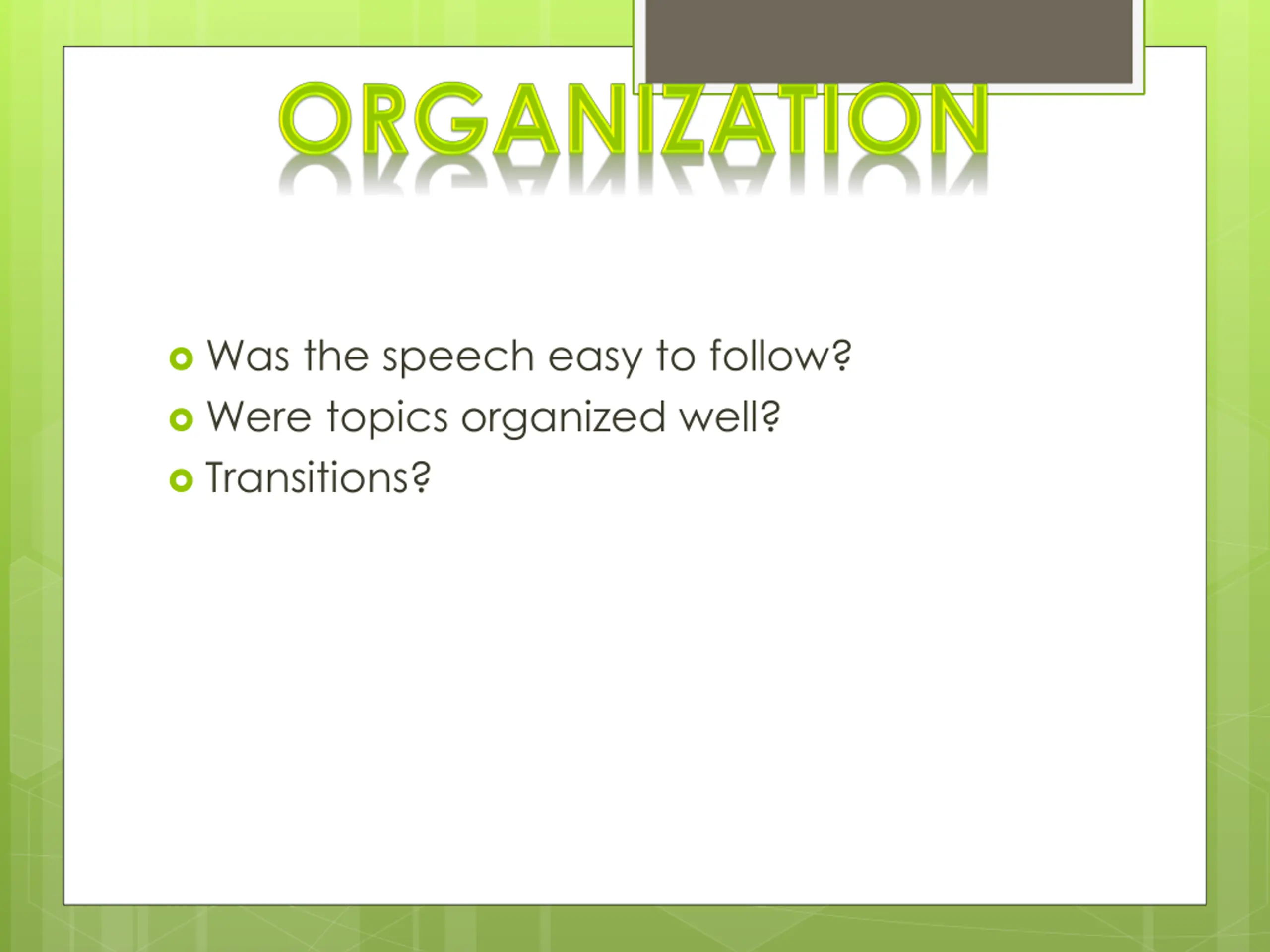 Was the speech easy to follow? Were topics organized well? Transitions?