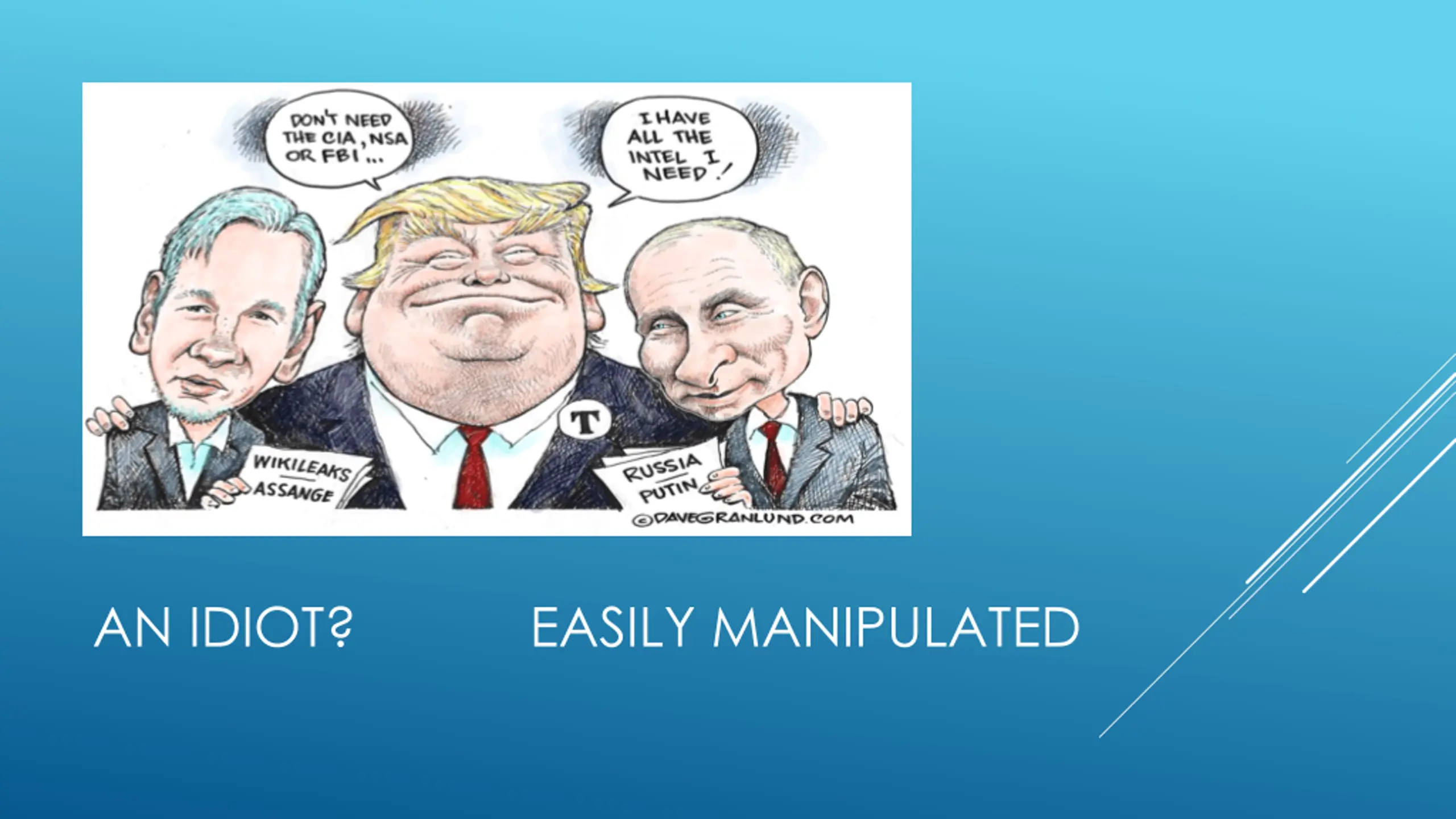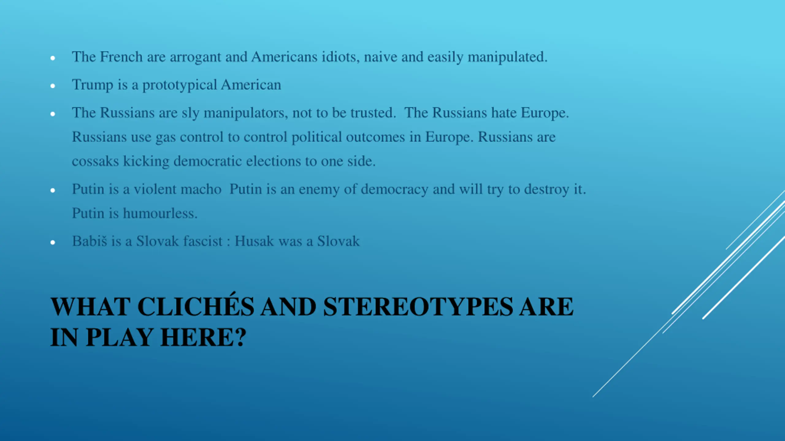 The French are arrogant and Americans idiots, naive and easily manipulated. Trump is a prototypical American The Russians are sly manipulators, not to be trusted. The Russians hate Europe. Russians use gas control to control political outcomes in Europe. Russians are cossaks kicking democratic elections to one side. Putin is a violent macho Putin is an enemy of democracy and will try to destroy it. Putin is humourless. Babi is a Slovak fascist : Husak was a Slovak WHAT CLICH S AND STEREOTYPES ARE IN PLAY HERE?