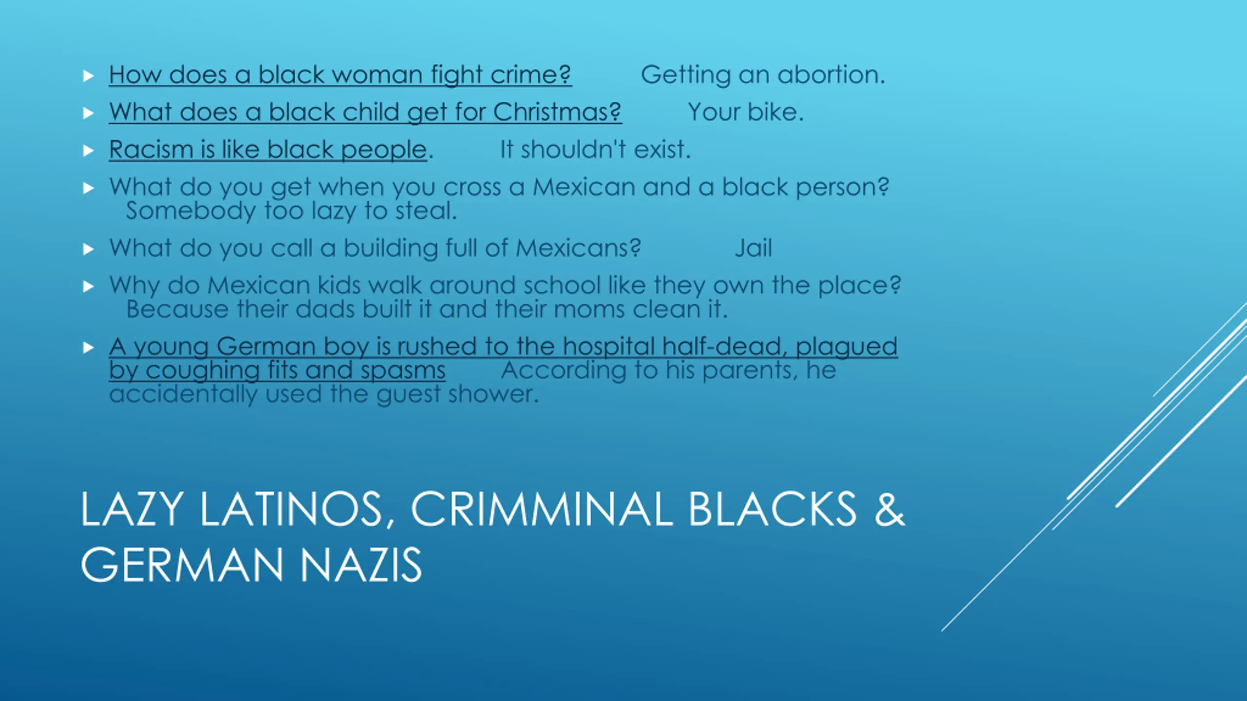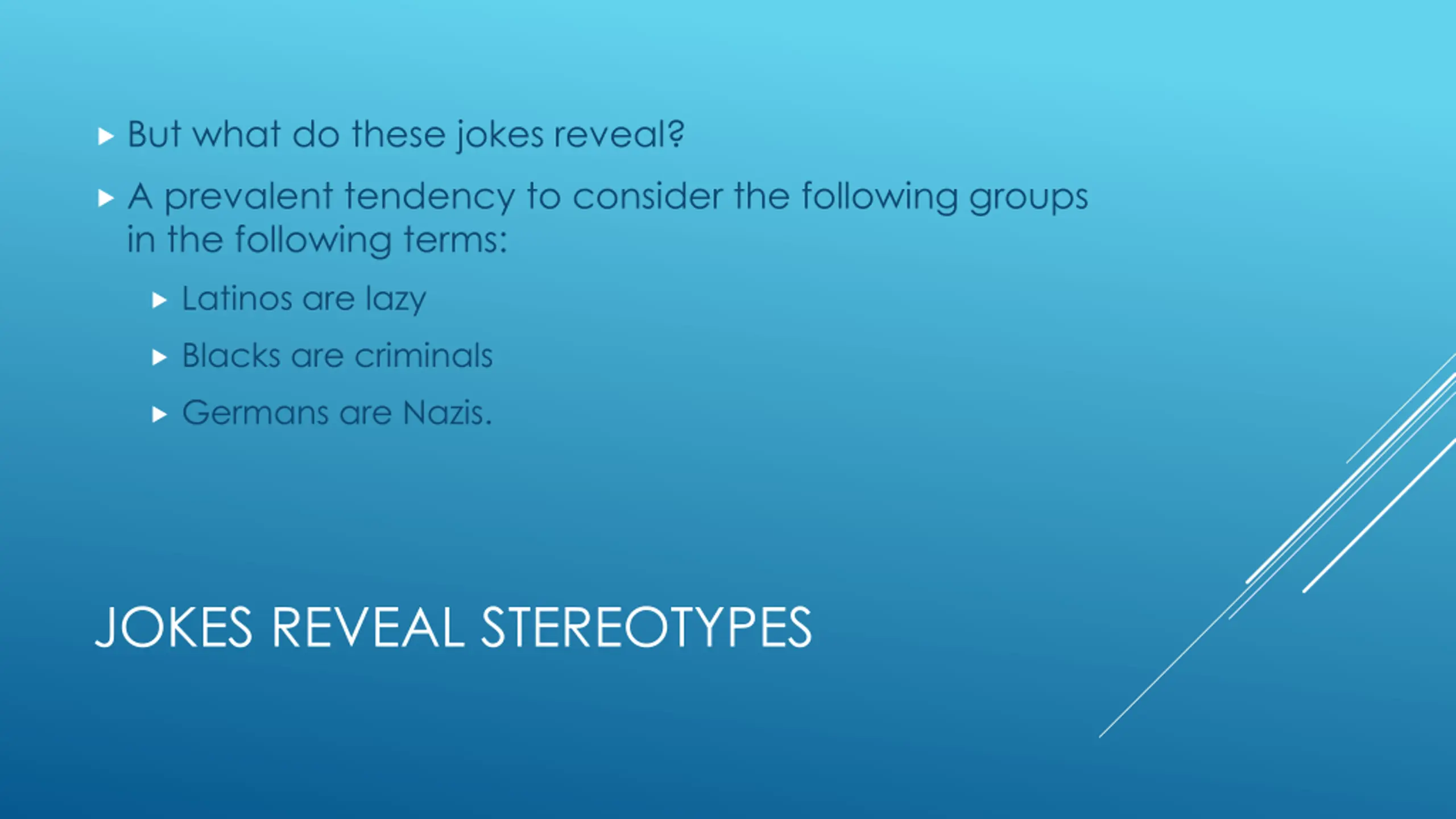 But what do these jokes reveal? A prevalent tendency to consider the following groups in the following terms: Latinos are lazy Blacks are criminals Germans are Nazis. JOKES REVEAL STEREOTYPES