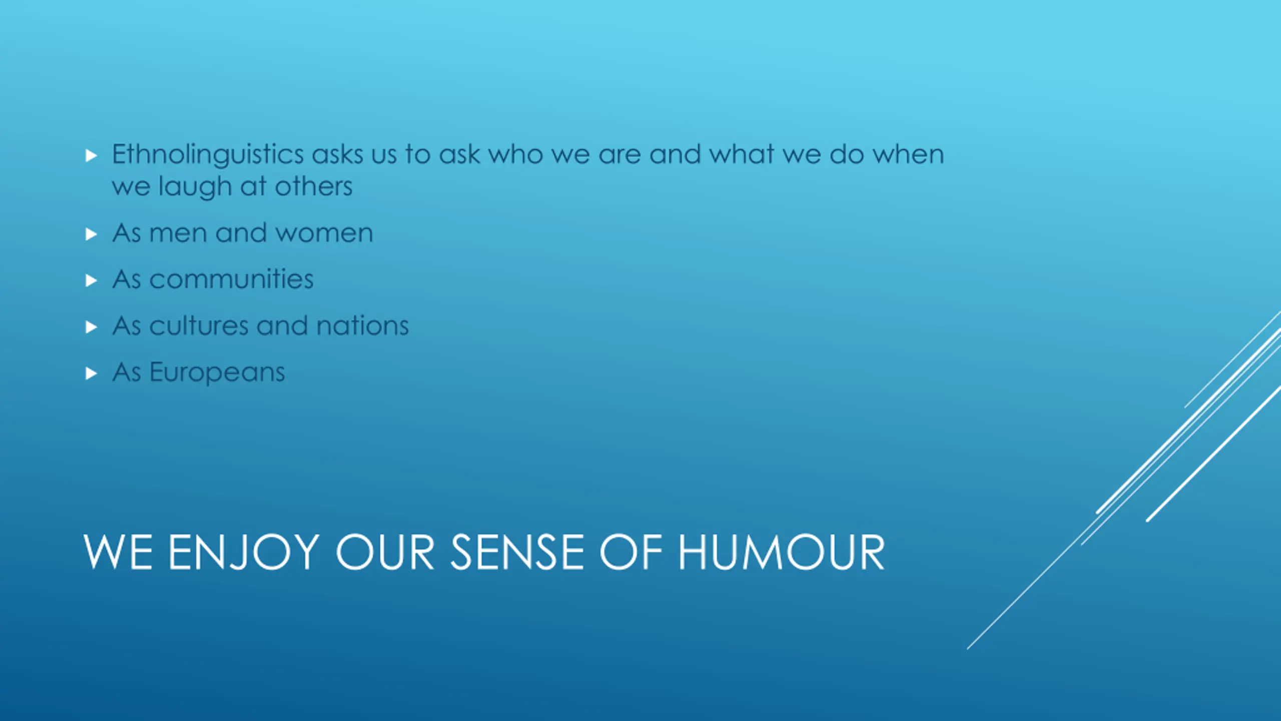 Ethnolinguistics asks us to ask who we are and what we do when we laugh at others As men and women As communities As cultures and nations As Europeans WE ENJOY OUR SENSE OF HUMOUR