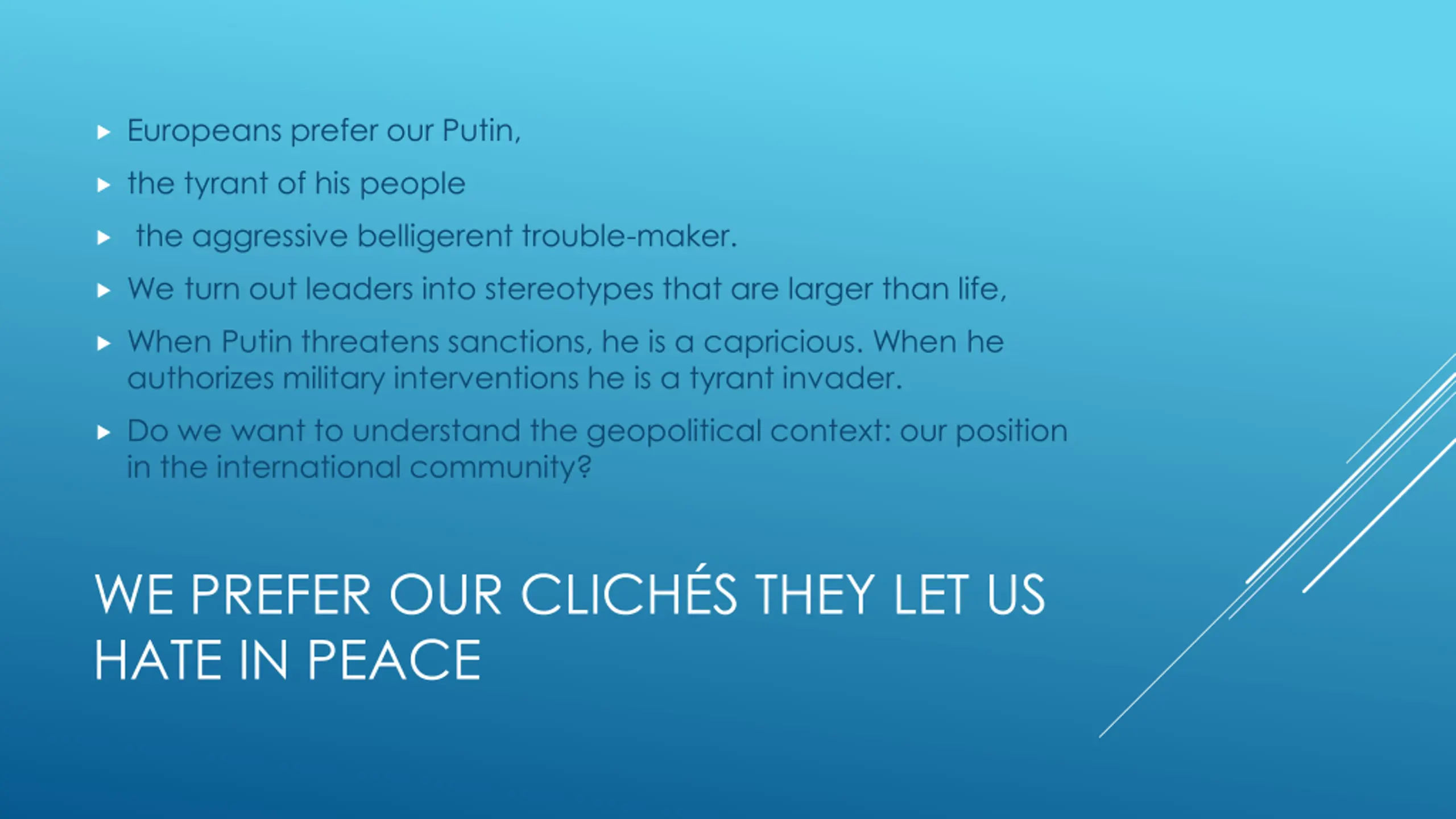 Europeans prefer our Putin, the tyrant of his people the aggressive belligerent trouble-maker. We turn out leaders into stereotypes that are larger than life, When Putin threatens sanctions, he is a capricious. When he authorizes military interventions he is a tyrant invader. Do we want to understand the geopolitical context: our position in the international community? WE PREFER OUR CLICH S THEY LET US HATE IN PEACE