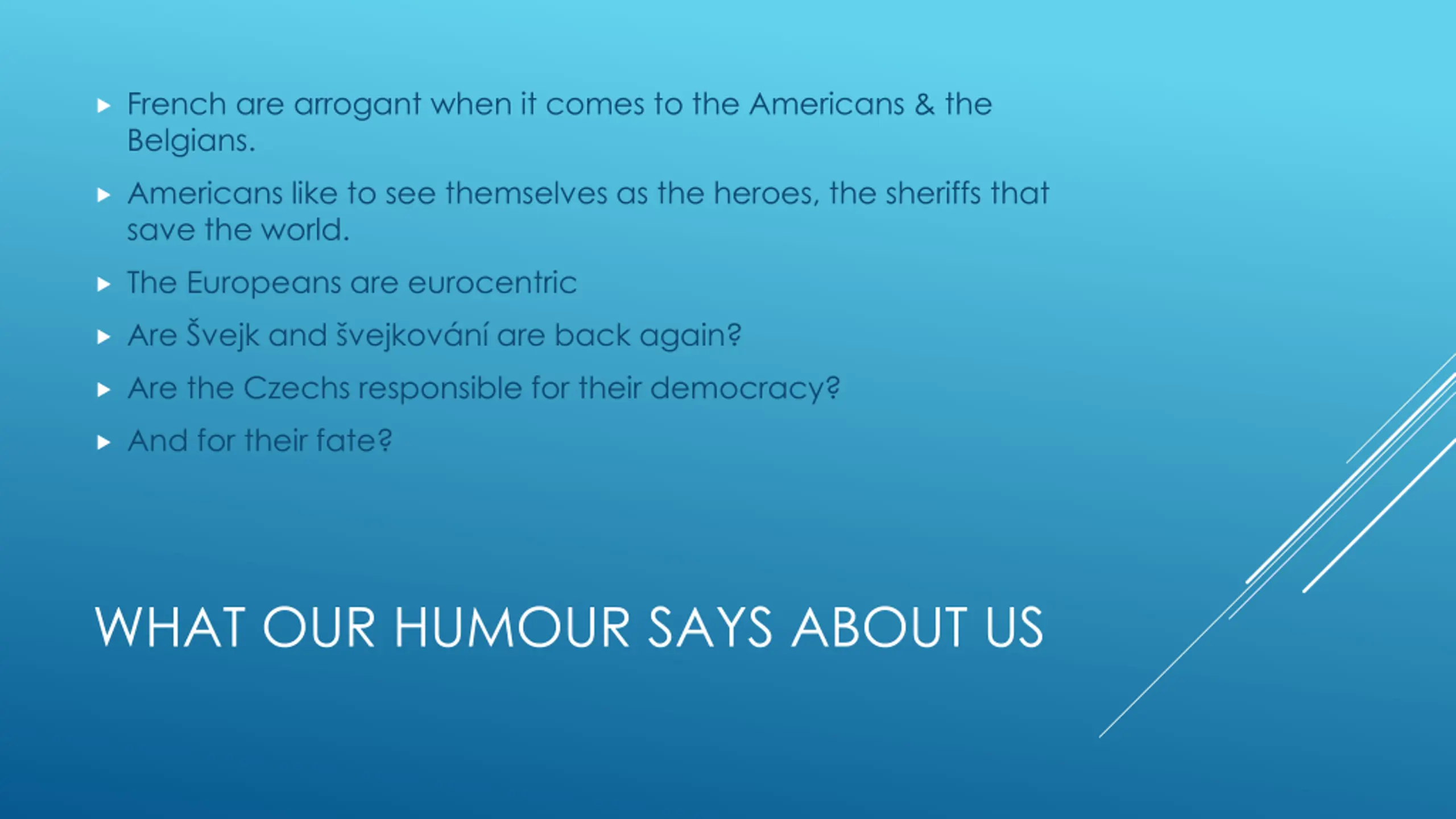 French are arrogant when it comes to the Americans & the Belgians. Americans like to see themselves as the heroes, the sheriffs that save the world. The Europeans are eurocentric Are vejk and vejkov n are back again? Are the Czechs responsible for their democracy? And for their fate? WHAT OUR HUMOUR SAYS ABOUT US