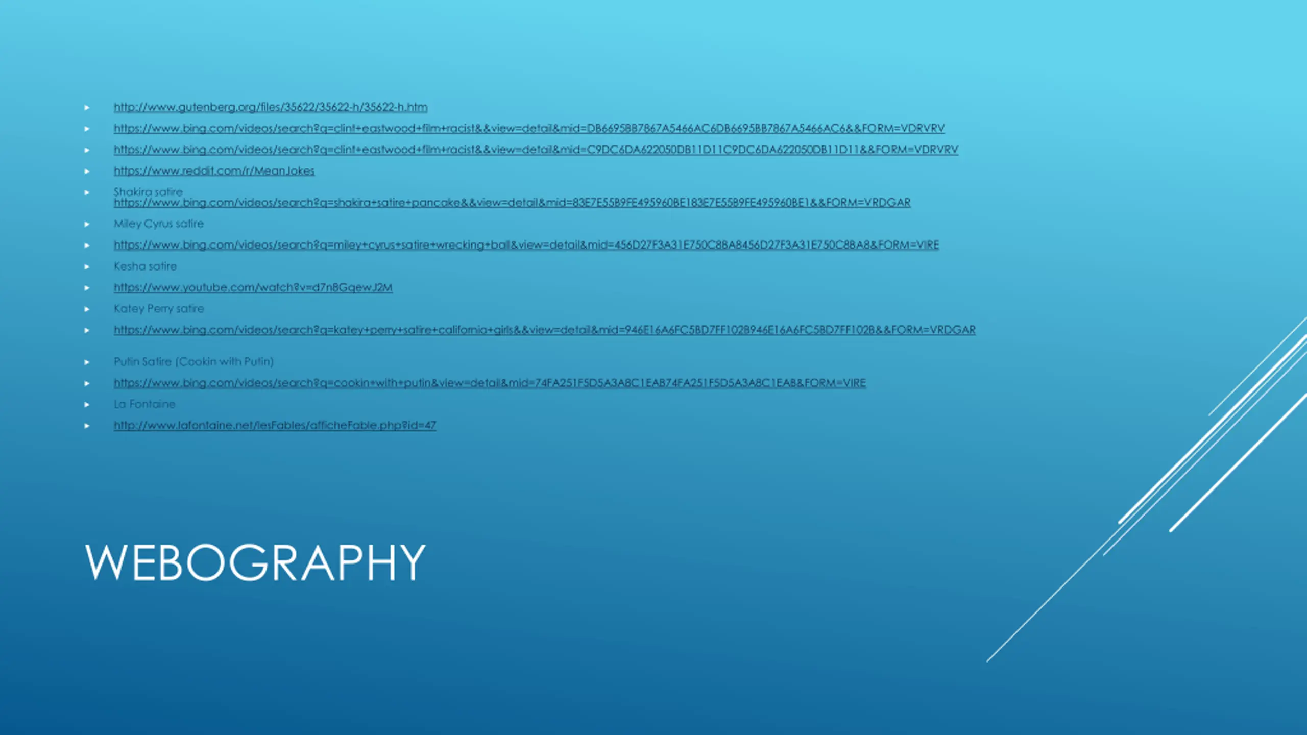 http://www.gutenberg.org/files/35622/35622-h/35622-h.htm https://www.bing.com/videos/search?q=clint+eastwood+film+racist&&view=detail&mid=DB6695BB7867A5466AC6DB6695BB7867A5466AC6&&FORM=VDRVRV https://www.bing.com/videos/search?q=clint+eastwood+film+racist&&view=detail&mid=C9DC6DA622050DB11D11C9DC6DA622050DB11D11&&FORM=VDRVRV https://www.reddit.com/r/MeanJokes Shakira satire https://www.bing.com/videos/search?q=shakira+satire+pancake&&view=detail&mid=83E7E55B9FE495960BE183E7E55B9FE495960BE1&&FORM=VRDGAR Miley Cyrus satire https://www.bing.com/videos/search?q=miley+cyrus+satire+wrecking+ball&view=detail&mid=456D27F3A31E750C8BA8456D27F3A31E750C8BA8&FORM=VIRE Kesha satire https://www.youtube.com/watch?v=d7n8GqewJ2M Katey Perry satire https://www.bing.com/videos/search?q=katey+perry+satire+california+girls&&view=detail&mid=946E16A6FC5BD7FF102B946E16A6FC5BD7FF102B&&FORM=VRDGAR Putin Satire (Cookin with Putin) https://www.bing.com/videos/search?q=cookin+with+putin&view=detail&mid=74FA251F5D5A3A8C1EAB74FA251F5D5A3A8C1EAB&FORM=VIRE La Fontaine http://www.lafontaine.net/lesFables/afficheFable.php?id=47 WEBOGRAPHY