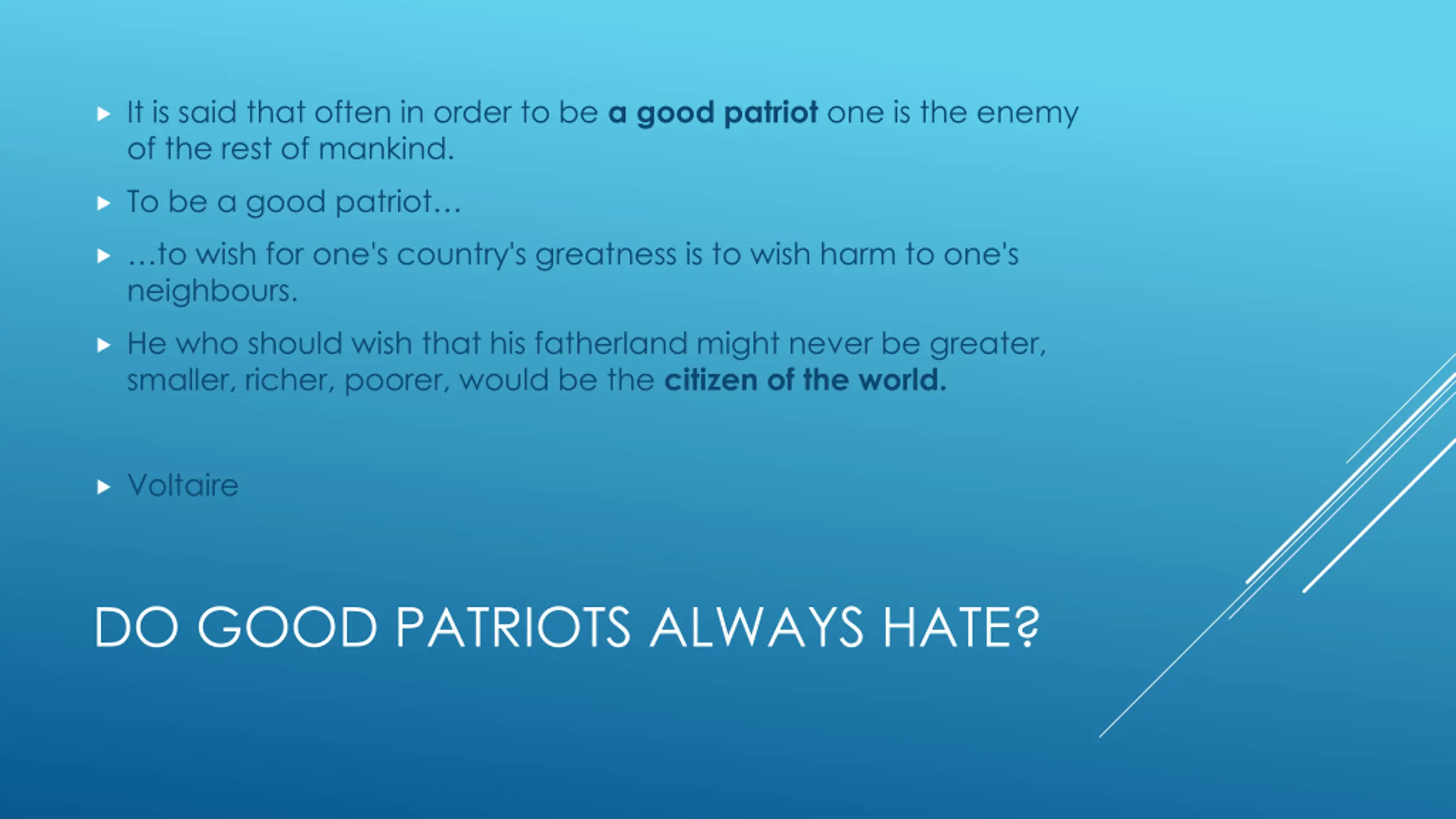 It is said that often in order to be a good patriot one is the enemy of the rest of mankind. To be a good patriot to wish for one's country's greatness is to wish harm to one's neighbours. He who should wish that his fatherland might never be greater, smaller, richer, poorer, would be the citizen of the world. Voltaire DO GOOD PATRIOTS ALWAYS HATE?