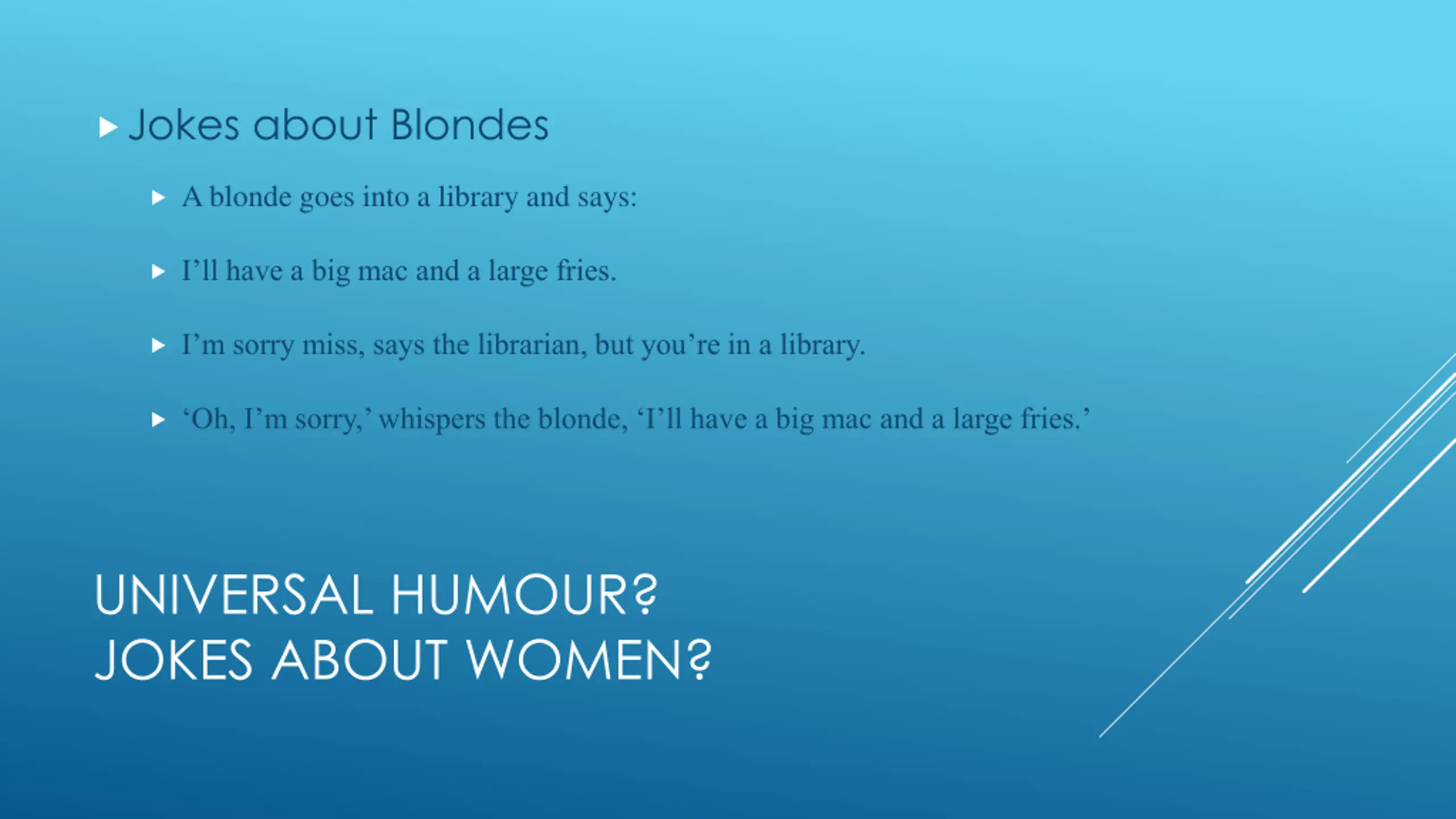 Jokes about Blondes A blonde goes into a library and says: I ll have a big mac and a large fries. I m sorry miss, says the librarian, but you re in a library. Oh, I m sorry, whispers the blonde, I ll have a big mac and a large fries. UNIVERSAL HUMOUR? JOKES ABOUT WOMEN?