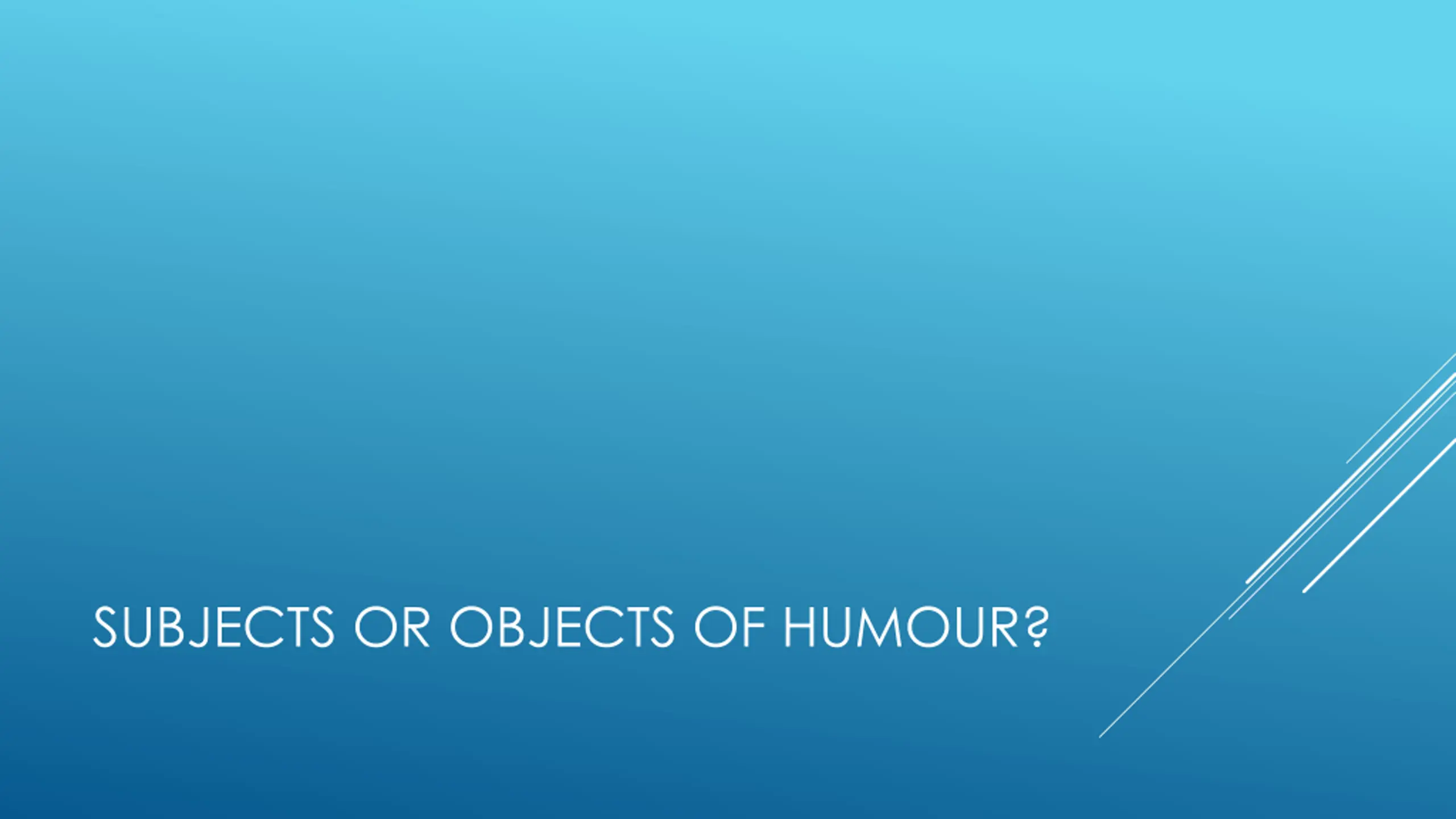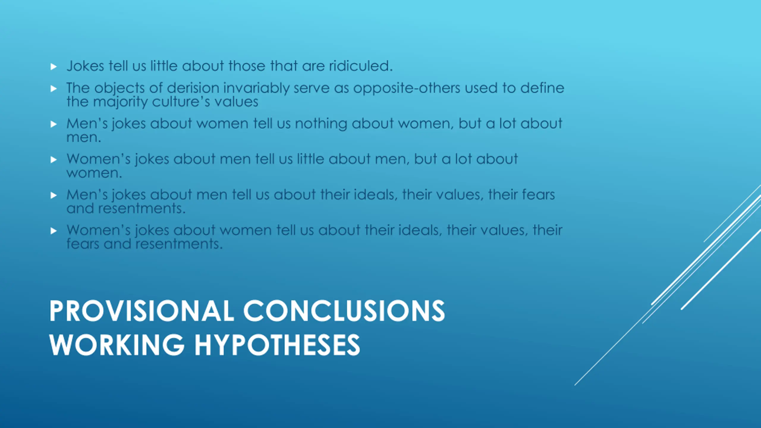Jokes tell us little about those that are ridiculed. The objects of derision invariably serve as opposite-others used to define the majority culture s values Men s jokes about women tell us nothing about women, but a lot about men. Women s jokes about men tell us little about men, but a lot about women. Men s jokes about men tell us about their ideals, their values, their fears and resentments. Women s jokes about women tell us about their ideals, their values, their fears and resentments. PROVISIONAL CONCLUSIONS WORKING HYPOTHESES