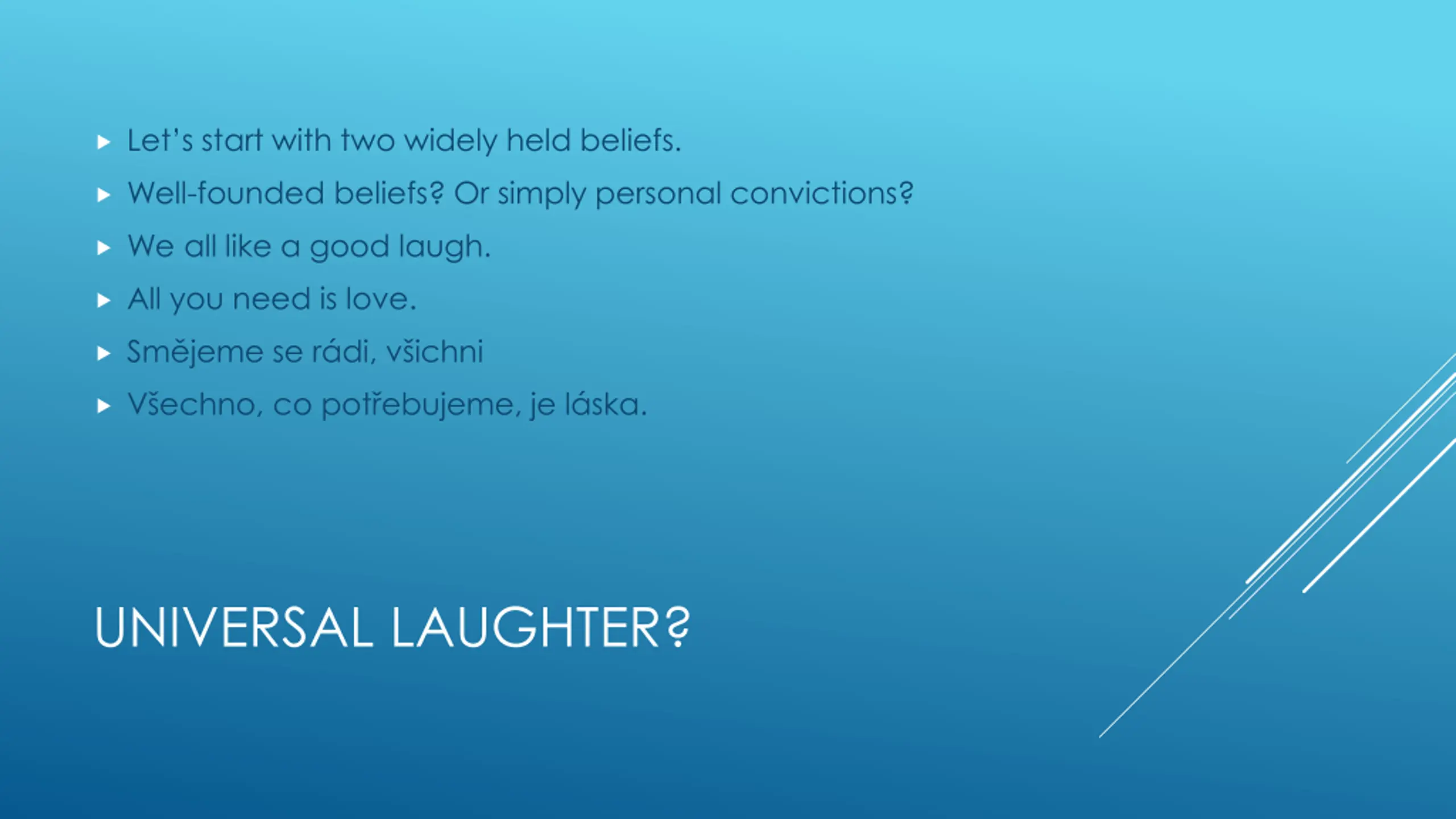 Lets start with two widely held beliefs. Well-founded beliefs? Or simply personal convictions? We all like a good laugh. All you need is love. Sm jeme se r di, v ichni V echno, co pot ebujeme, je l ska. UNIVERSAL LAUGHTER?