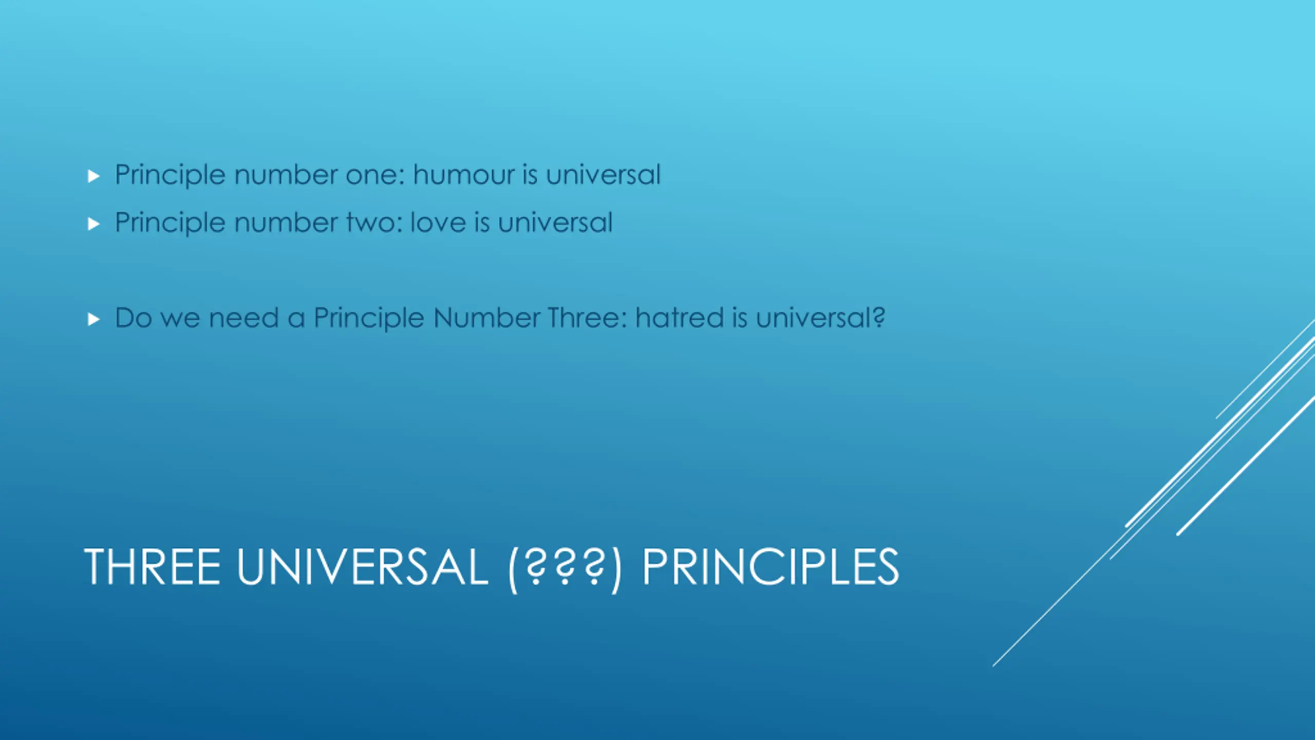 Principle number one: humour is universal Principle number two: love is universal Do we need a Principle Number Three: hatred is universal? THREE UNIVERSAL (???) PRINCIPLES