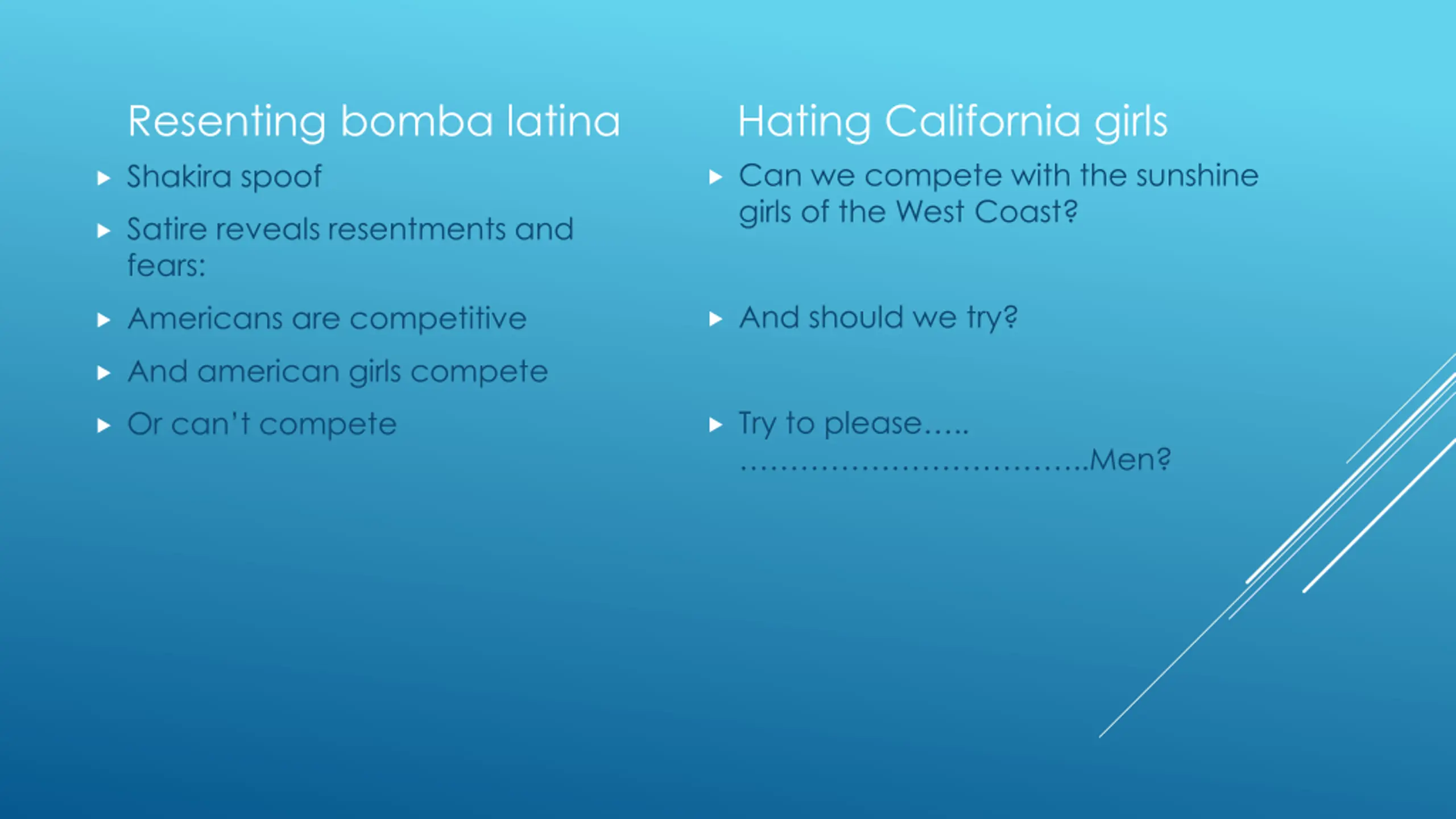 Resenting bomba latina Shakira spoof Hating California girls Can we compete with the sunshine girls of the West Coast? Satire reveals resentments and fears: And should we try? Americans are competitive And american girls compete Try to please .. ..Men? Or can t compete