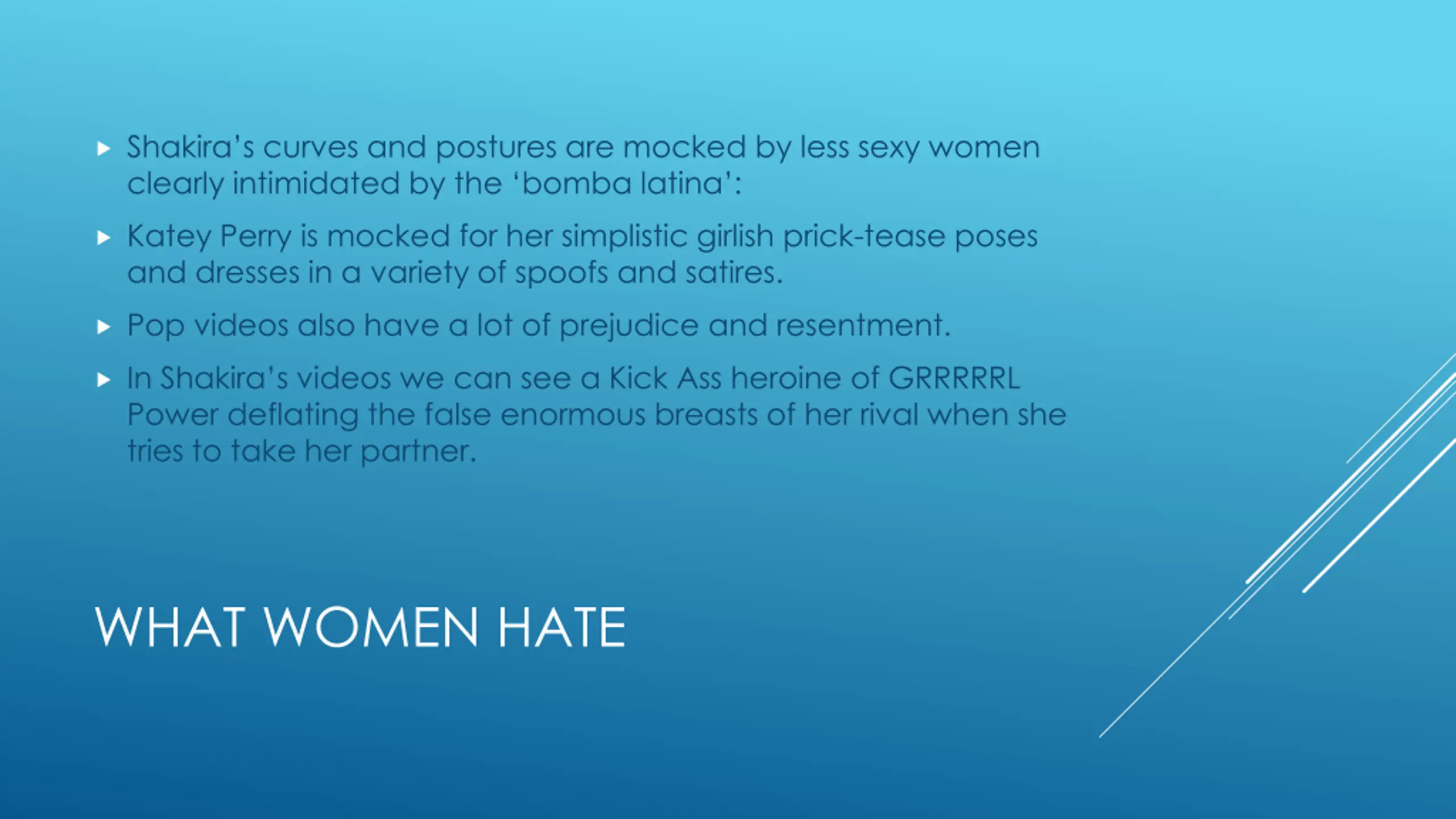 Shakiras curves and postures are mocked by less sexy women clearly intimidated by the bomba latina : Katey Perry is mocked for her simplistic girlish prick-tease poses and dresses in a variety of spoofs and satires. Pop videos also have a lot of prejudice and resentment. In Shakira s videos we can see a Kick Ass heroine of GRRRRRL Power deflating the false enormous breasts of her rival when she tries to take her partner. WHAT WOMEN HATE
