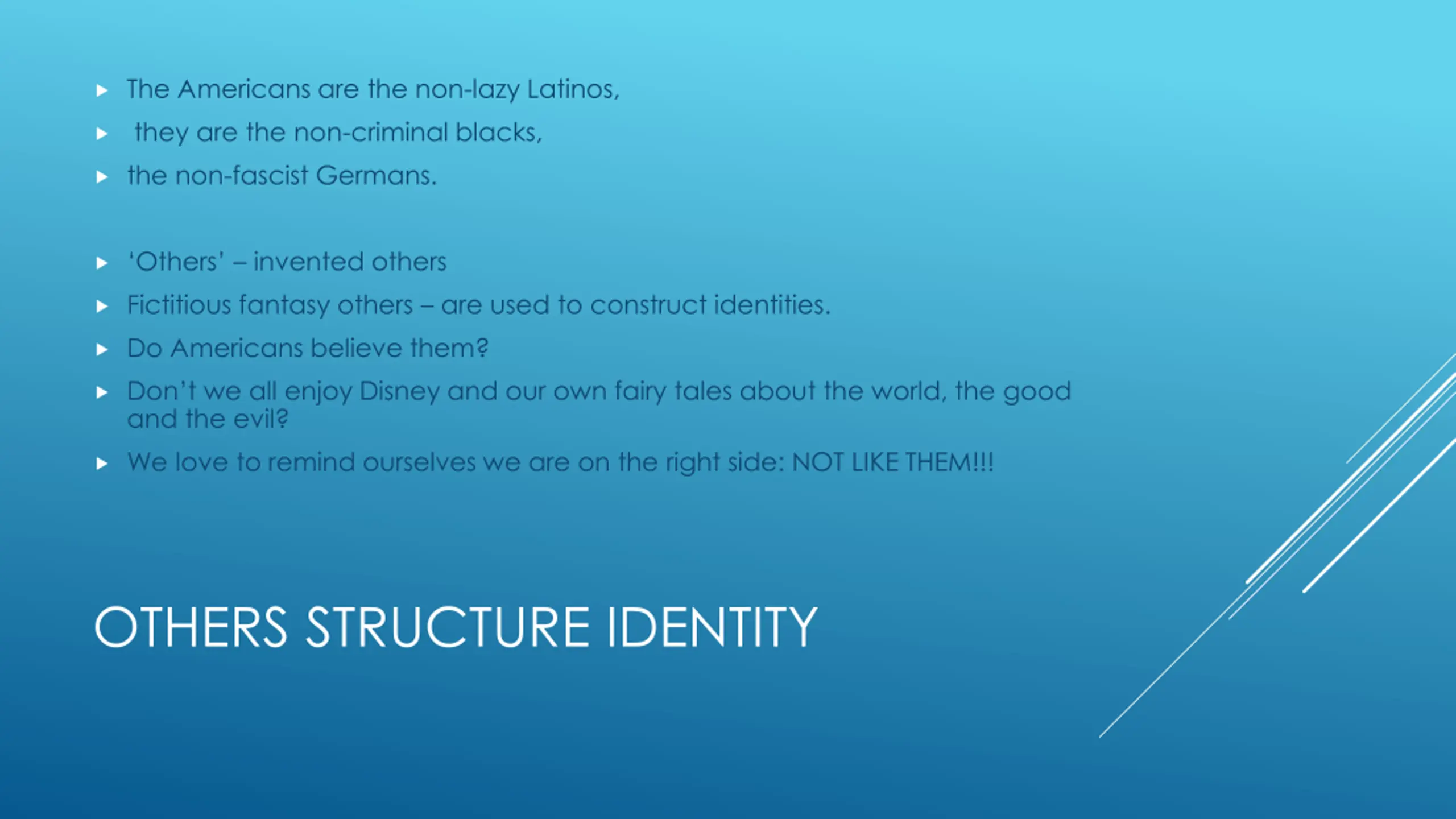 The Americans are the non-lazy Latinos, they are the non-criminal blacks, the non-fascist Germans. Others invented others Fictitious fantasy others are used to construct identities. Do Americans believe them? Don t we all enjoy Disney and our own fairy tales about the world, the good and the evil? We love to remind ourselves we are on the right side: NOT LIKE THEM!!! OTHERS STRUCTURE IDENTITY
