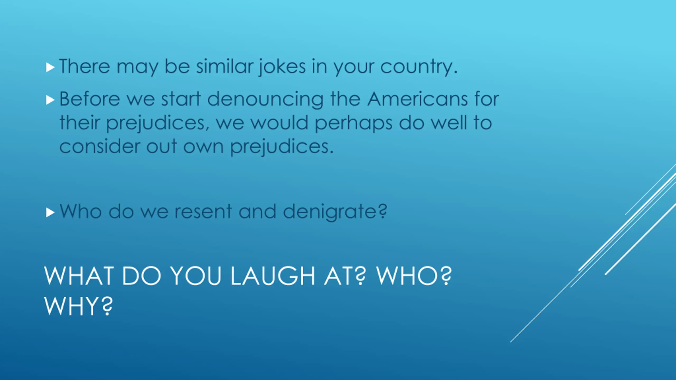 There may be similar jokes in your country. Before we start denouncing the Americans for their prejudices, we would perhaps do well to consider out own prejudices. Who do we resent and denigrate? WHAT DO YOU LAUGH AT? WHO? WHY?